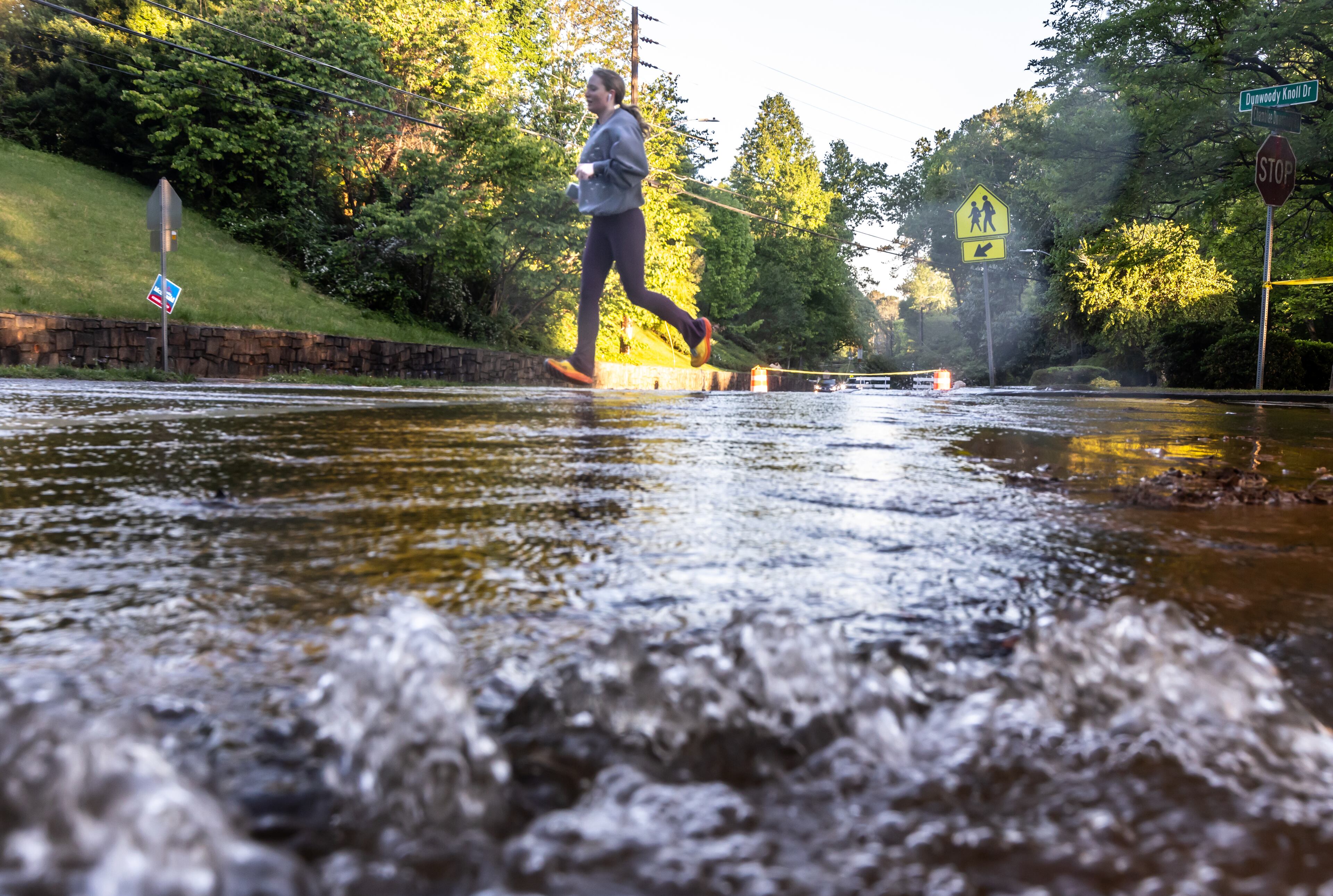 AJC photographer John Spink captured a jogger navigating the water-soaked intersection of Chamblee-Dunwoody Road and Dunwoody Knoll Drive, where crews worked throughout Monday to repair a water main break.