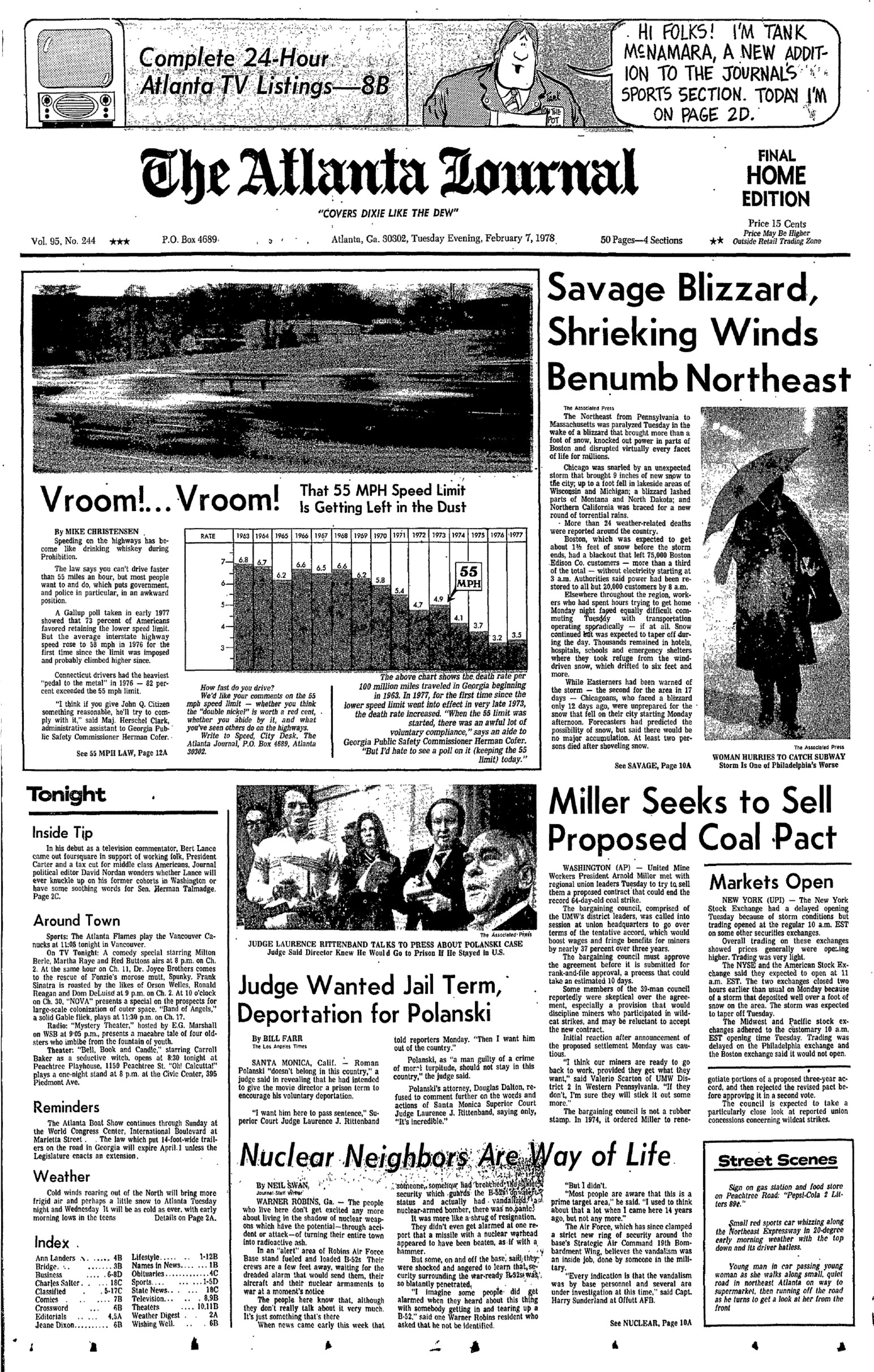 From the front page of The Atlanta Journal: Vroom! Vroom! Speeding on the highways has become like drinking whiskey during Prohibition. The law says you can’t drive faster than 55 miles an hour, but most people want to and do … Well, it’s 65 now, so the will of the people wins.