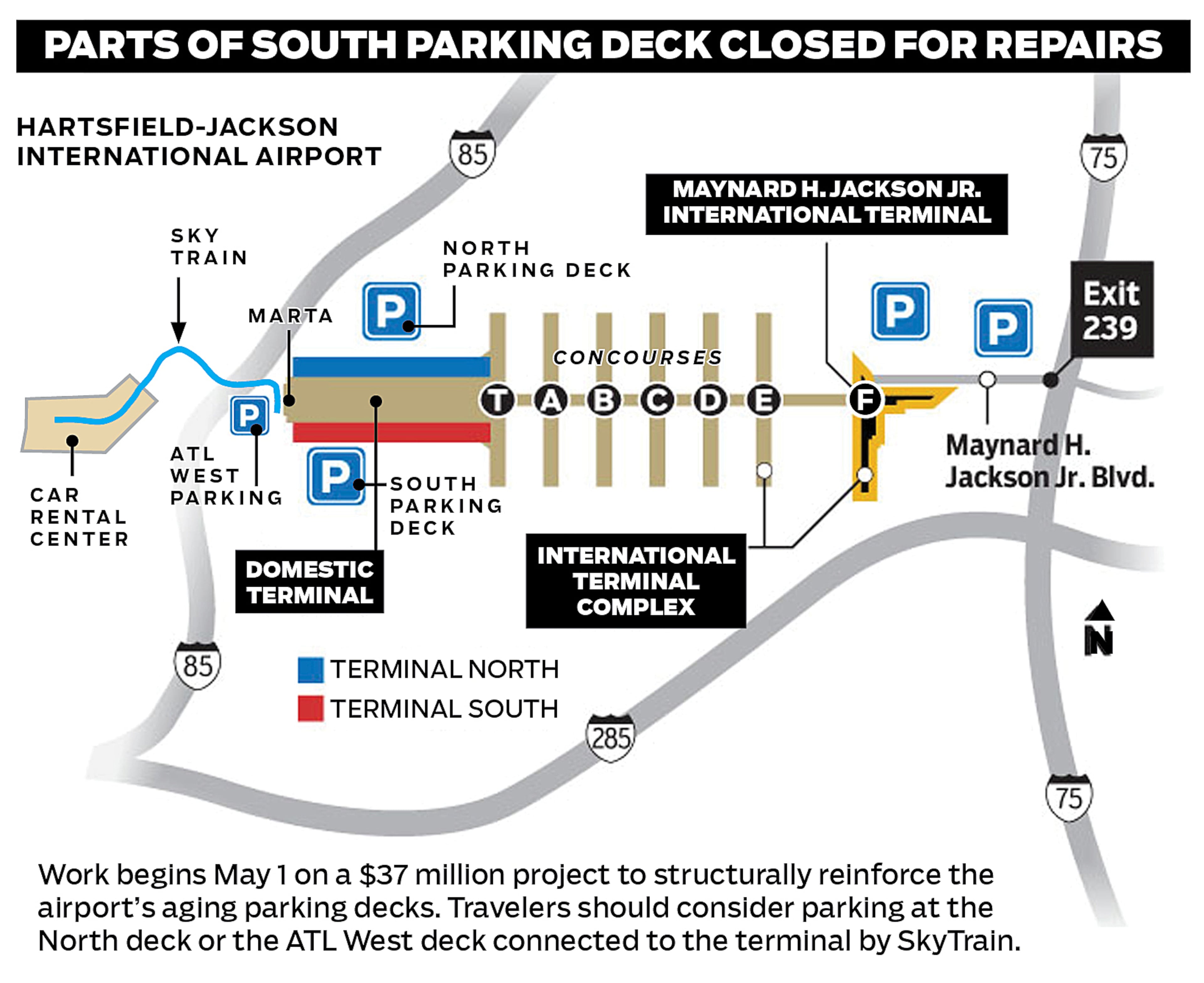 The parking decks will not completely close while the reinforcement work is done, but the project will take about 2,500 South deck parking spaces out of commission at a time. The decks have long tended to fill up during busy periods, and the construction work means travelers will be diverted to other decks or lots even more often.