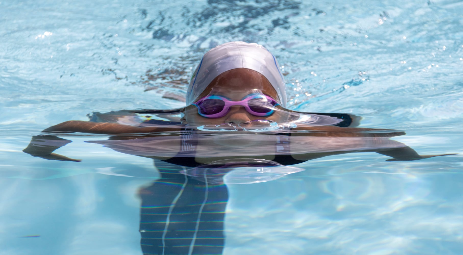 In the first of her four practice races for the upcoming swim team season at the Leslie Beach Club, the 8-year-old, wearing a “Just Do It” swimsuit, gracefully dove into the water and easily won her freestyle heat.