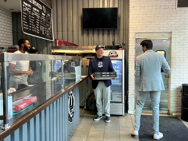 After visiting Jonesboro and Sandy Springs, Emhoff made a stop at the Triple Jays Pizza Bar in Midtown Atlanta where he picked up six pizzas and later delivered them to volunteers at the campaign’s field office in Decatur.