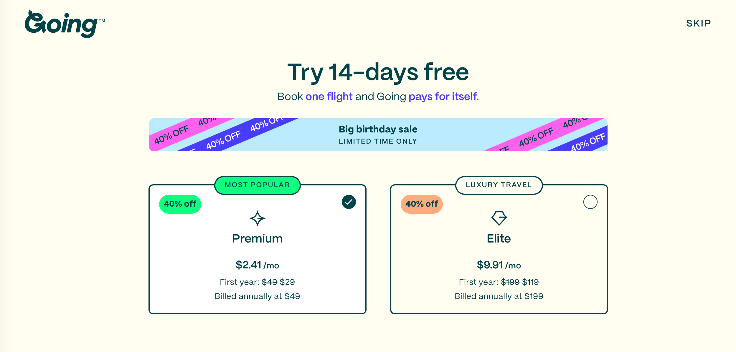 Going is pulling out all the stops for their birthday by offering an incredible deal for their customers. They are offering a free 14-day trial and a 40% discount on Premium and Elite memberships.