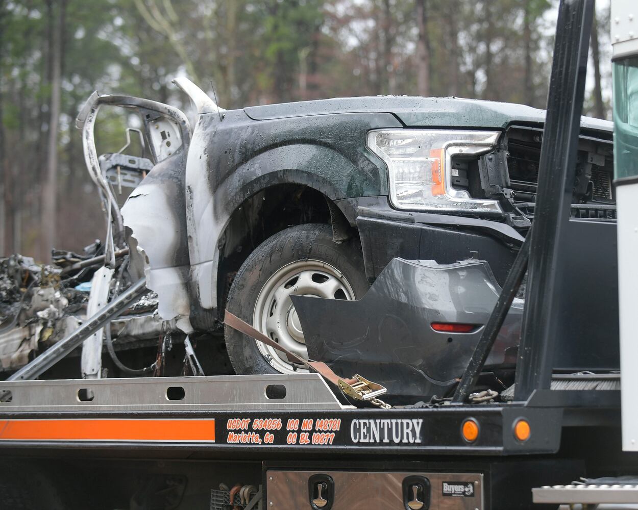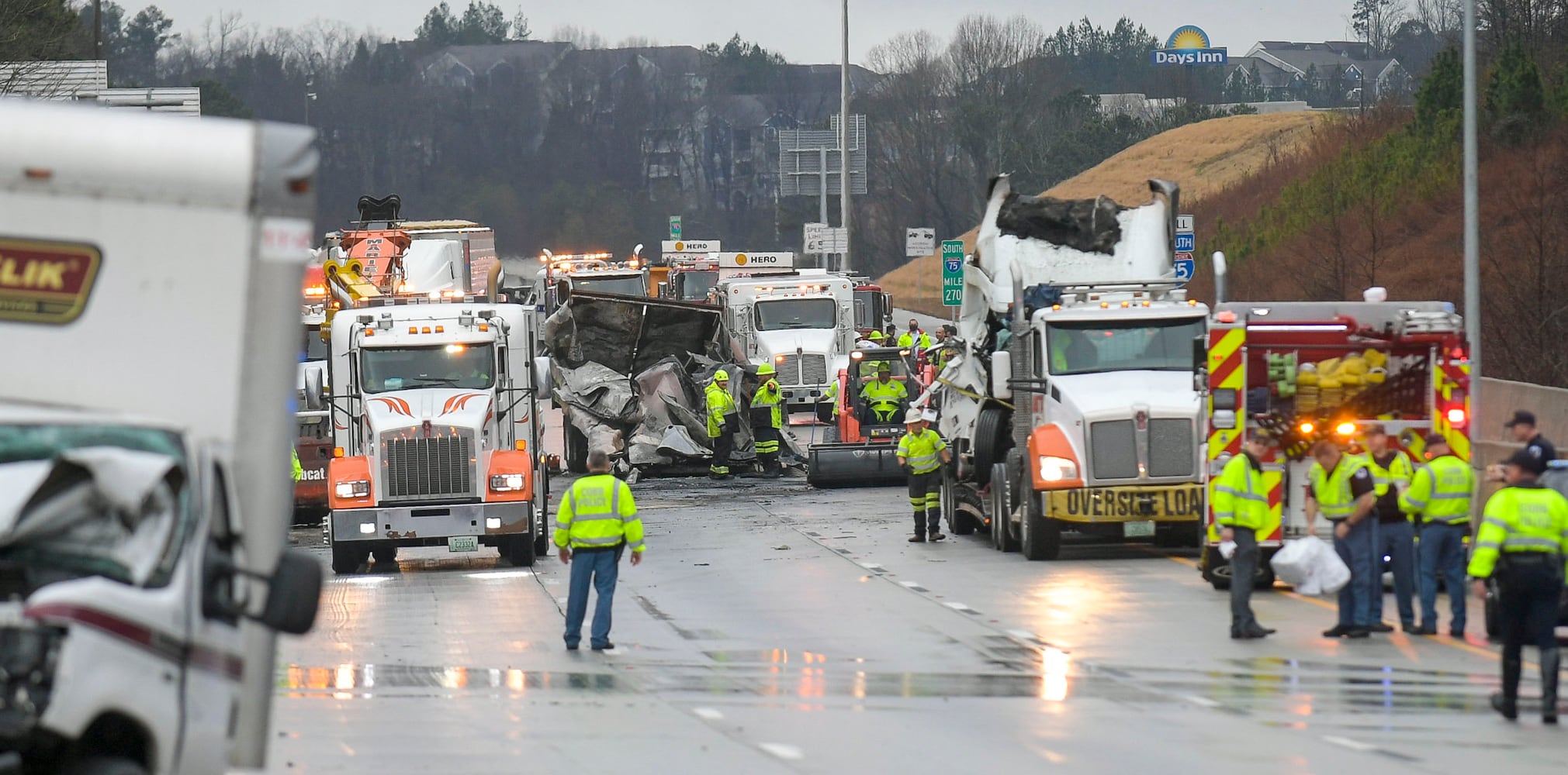 Footage from GDOT cameras in the area showed multiple firetrucks blocking the interstate as smoke rose from a big rig. Video footage showed at least two crumpled cars and a tractor-trailer being consumed by flames.