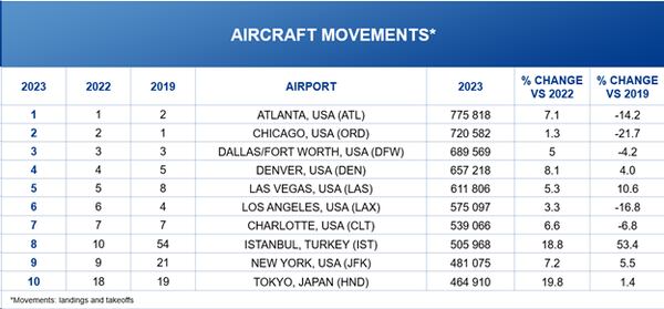 In addition to its ranking for passenger counts, ATL also handled the most flights in the world in 2023 — followed by Chicago O’Hare and Dallas/Fort Worth at No. 3.