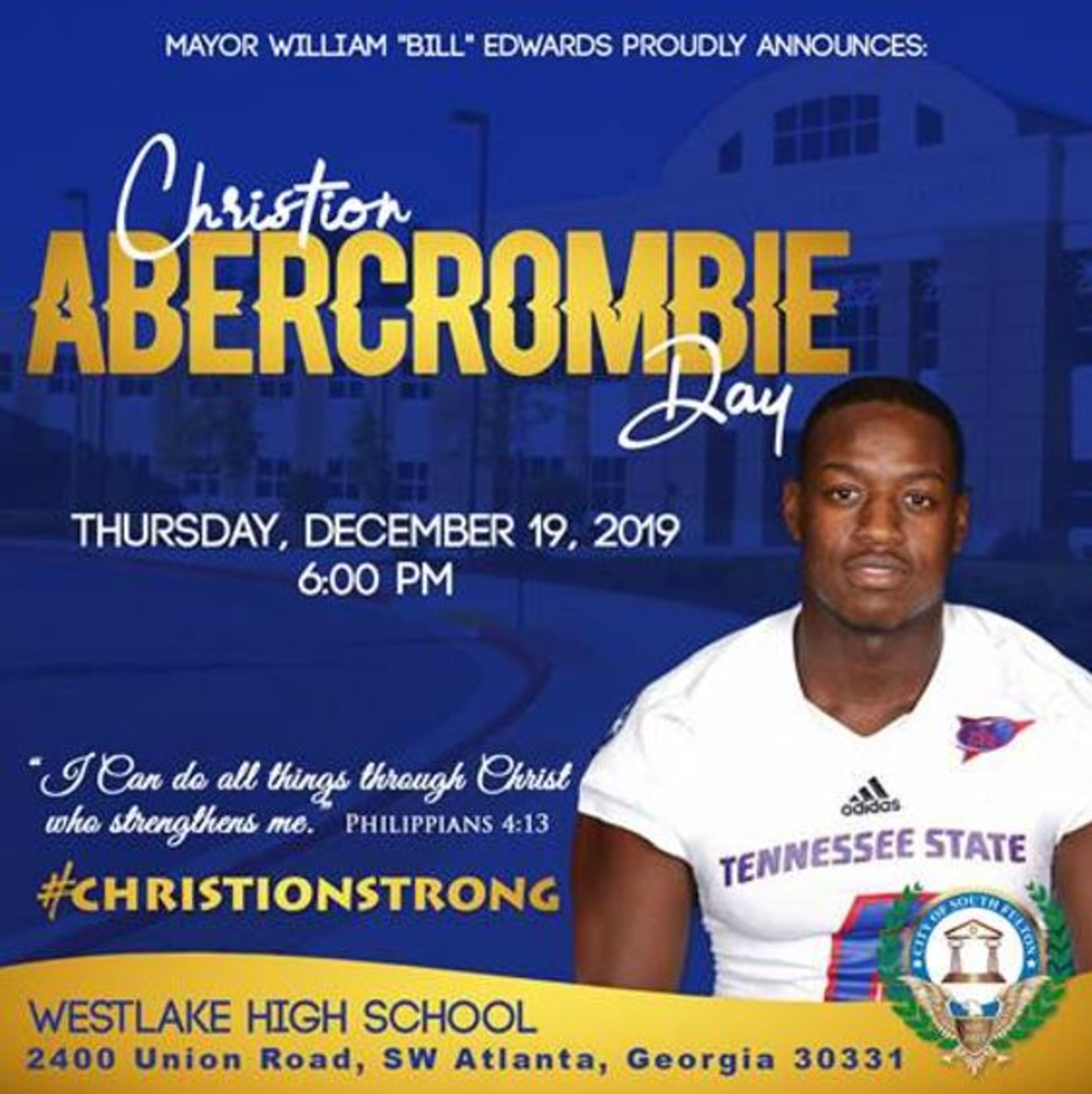 Thursday’s event at Westlake High starts at 6 p.m. and will include Abercrombie, his family and South Fulton Mayor Bill Edwards, city officials said. Staci Abercrombie said her son’s former football coaches from Little League through college also plan on attending.