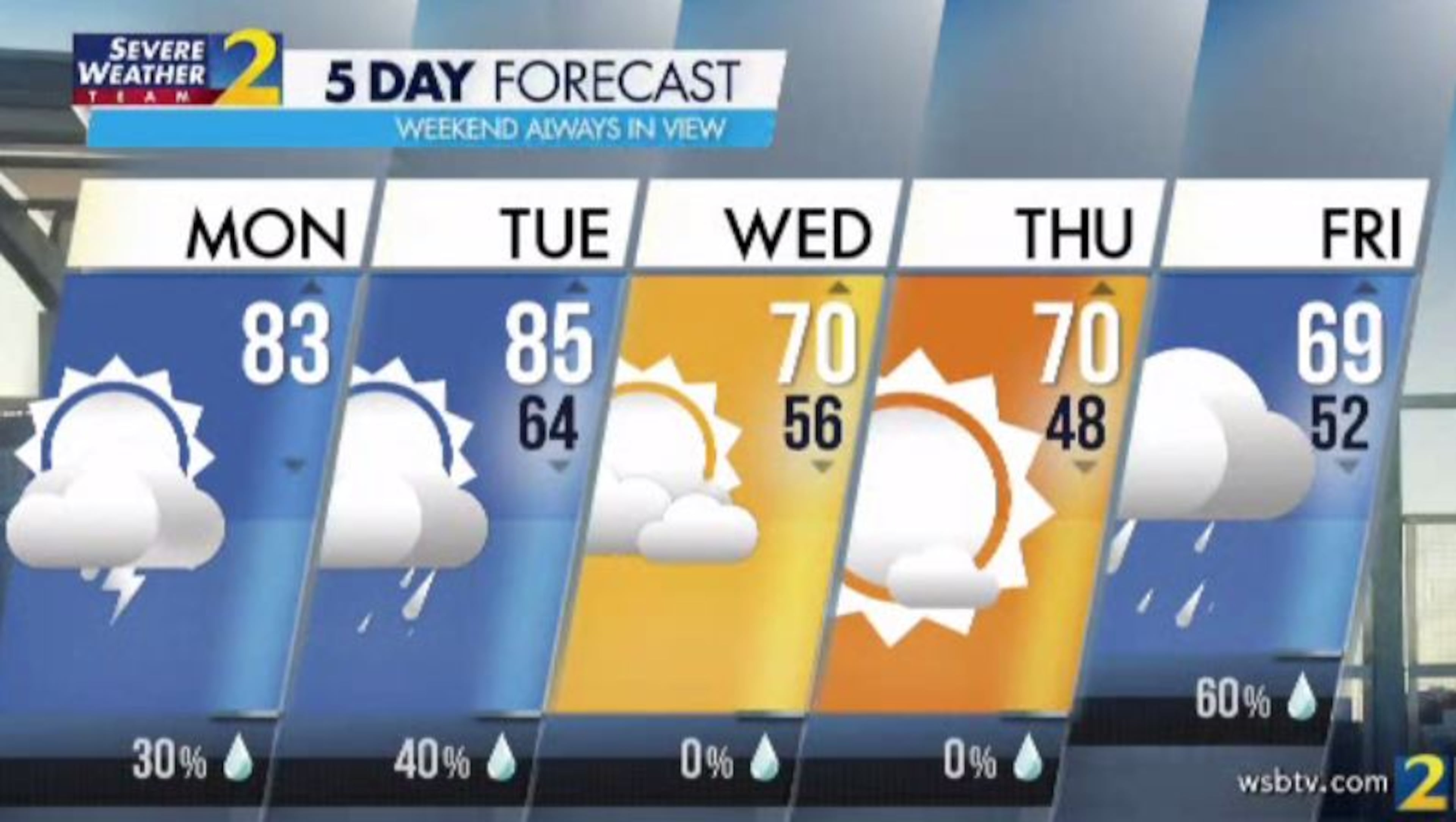 A cold front will not mean cooler weather, however. Temperatures are again headed for the low 80s Monday afternoon, according to Channel 2. Atlanta’s projected high is 83 degrees