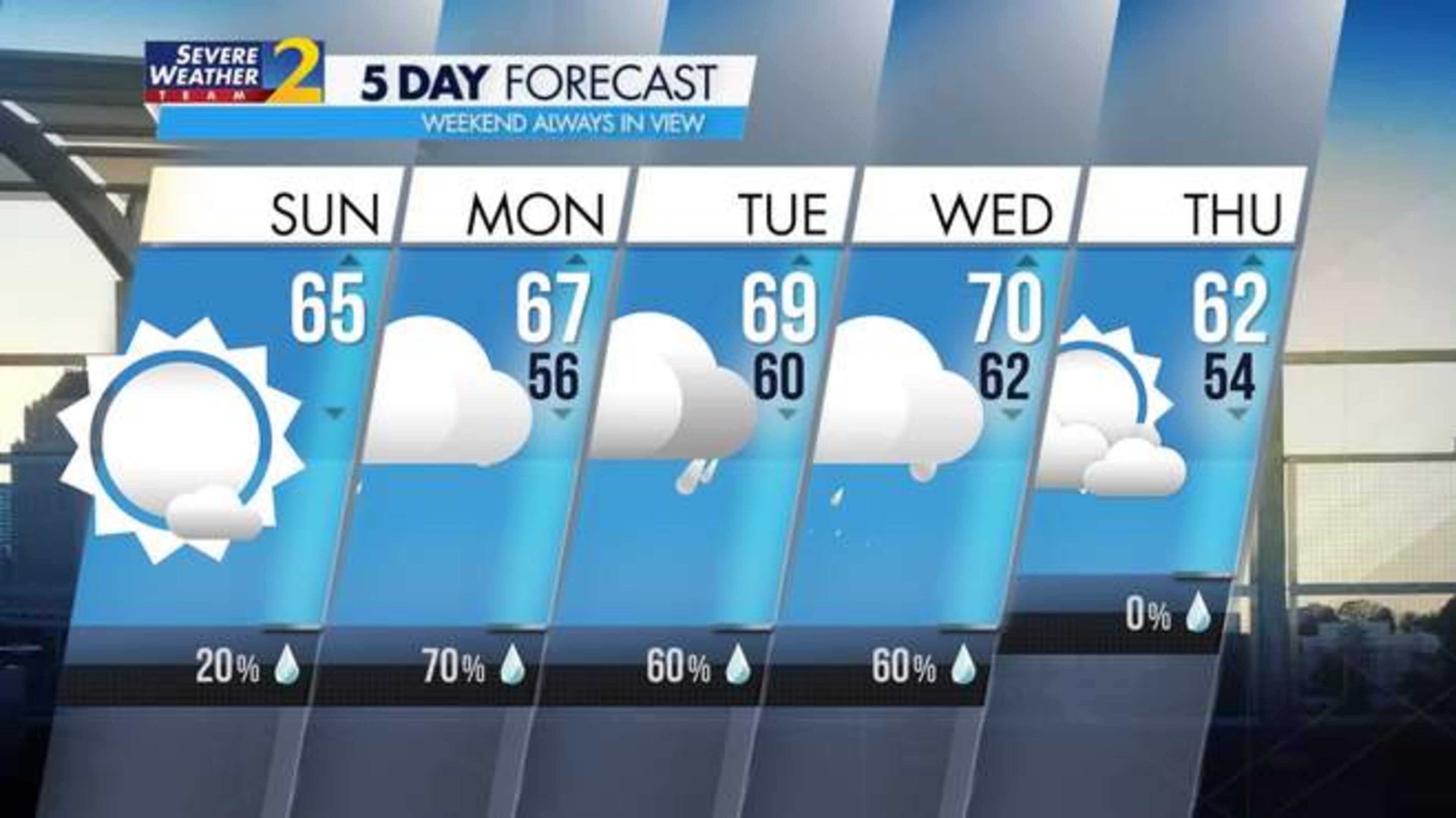 That all changes on Sunday, where it’s expected to be partly cloudy with a high of 65 degrees and just a 30% chance of showers, Channel 2 meteorologist Eboni Deon said.