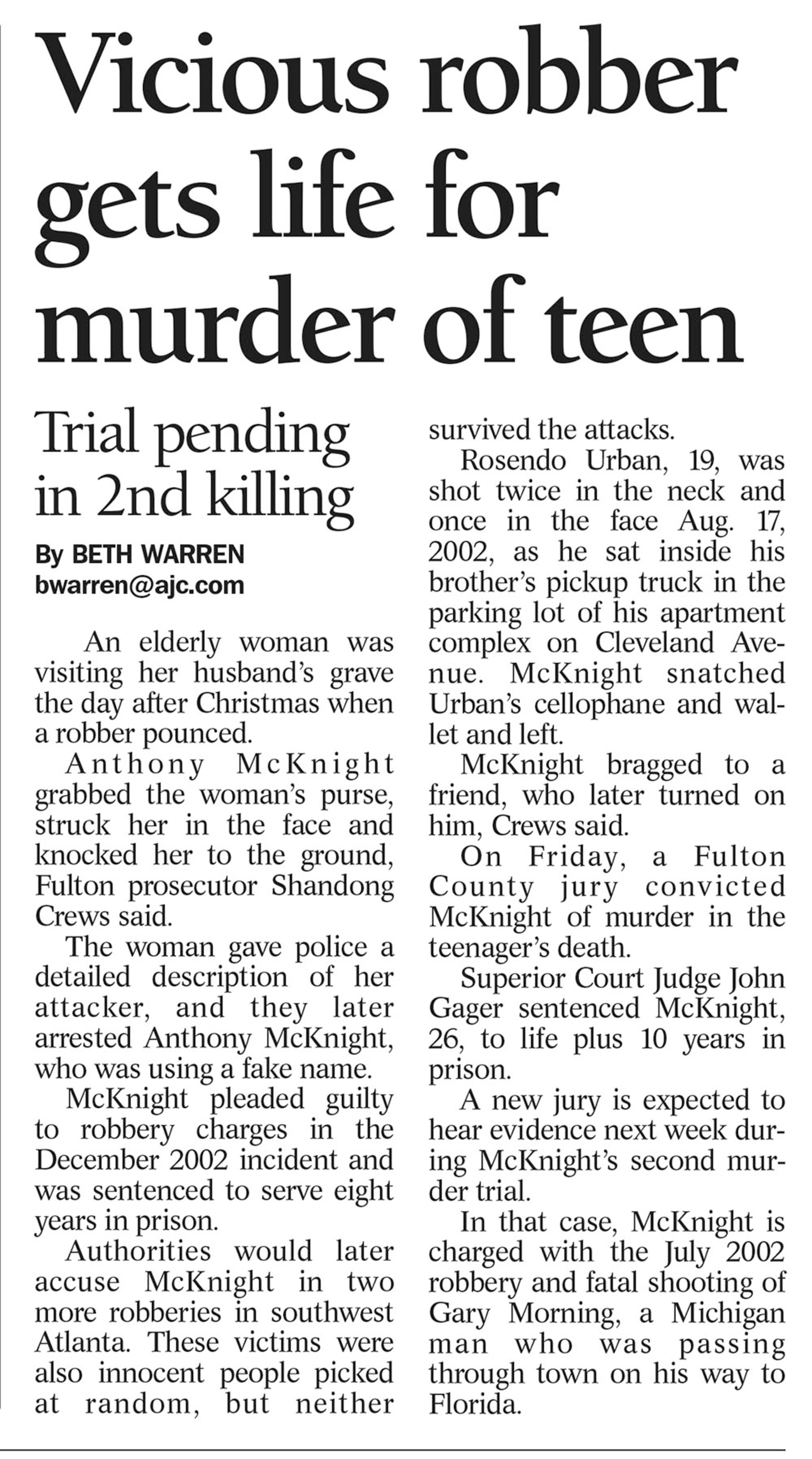 The AJC did not cover the death of Urban in 2002 but later followed developments in the 2004 trial of Anthony McKnight, who was convicted of killing Urban. McKnight was soon convicted of killing another man in a separate incident.