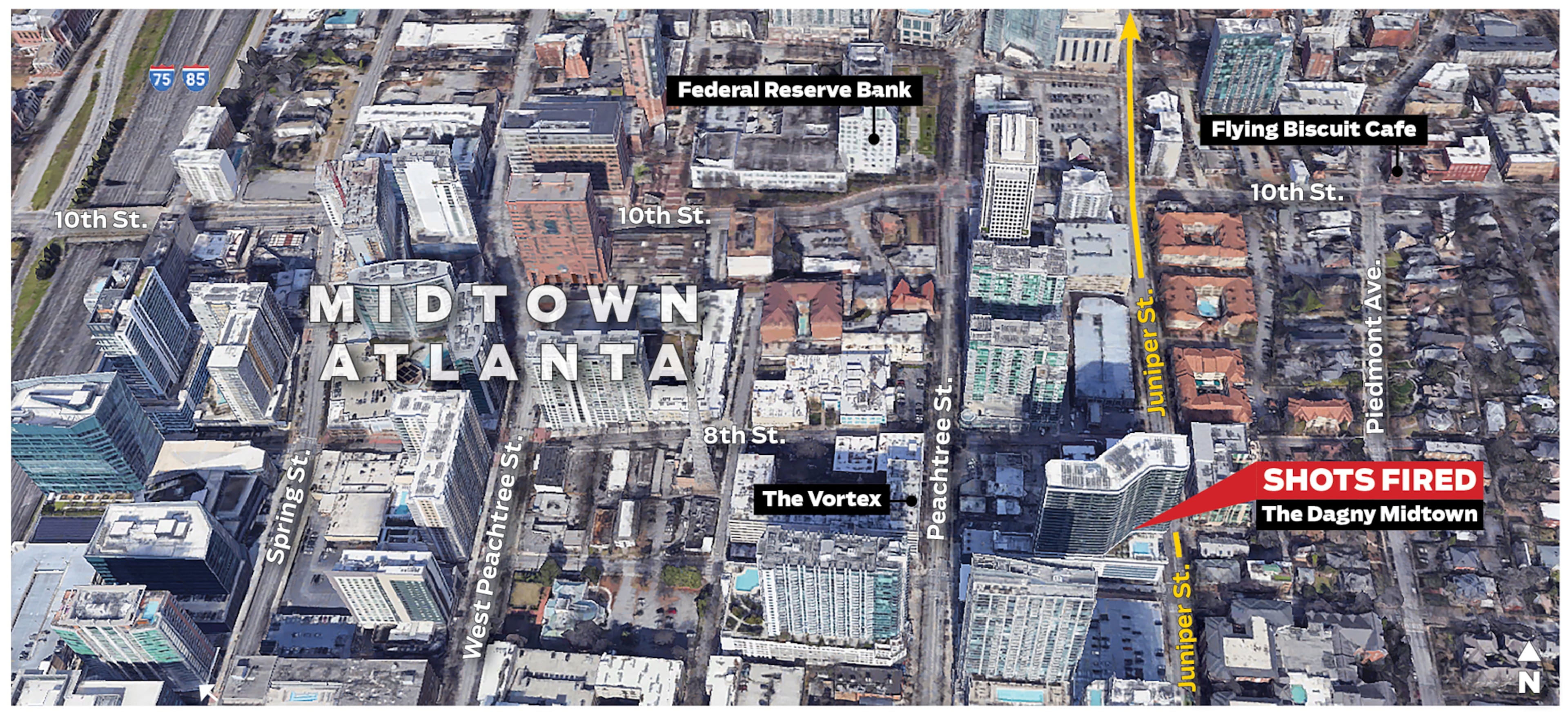 The victim was discovered around 2:45 a.m. by officers responding to a report of shots fired at The Dagny Midtown building on Juniper Street. He was identified by the Fulton County Medical Examiner’s Office as Desmond Key, 35.