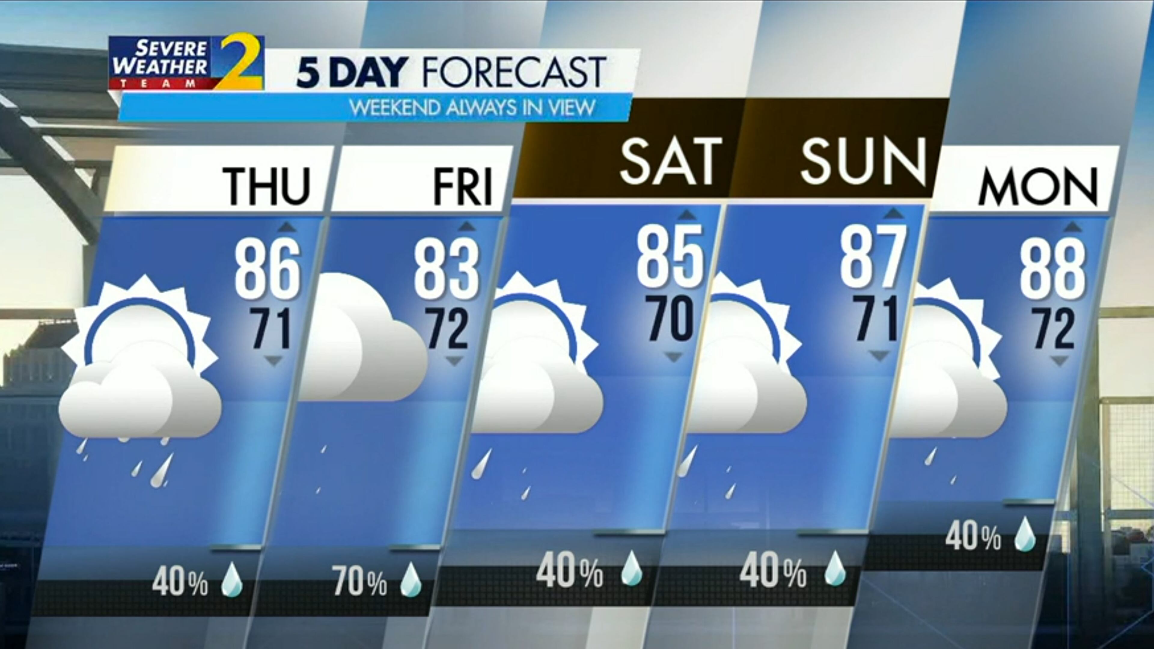 Channel 2 Action News meteorologist Brad Nitz forecasts “a partly cloudy start to the day. It’ll be dry, a little bit of sunshine mixed in. It’s going to be humid.