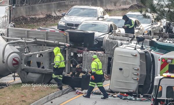 The crash was reported before 7 a.m. near Hicks Road, according to the Cobb Department of Transportation. Cobb police confirmed their officers worked a crash involving three vehicles, including the big rig that flipped over and blocked several lanes.