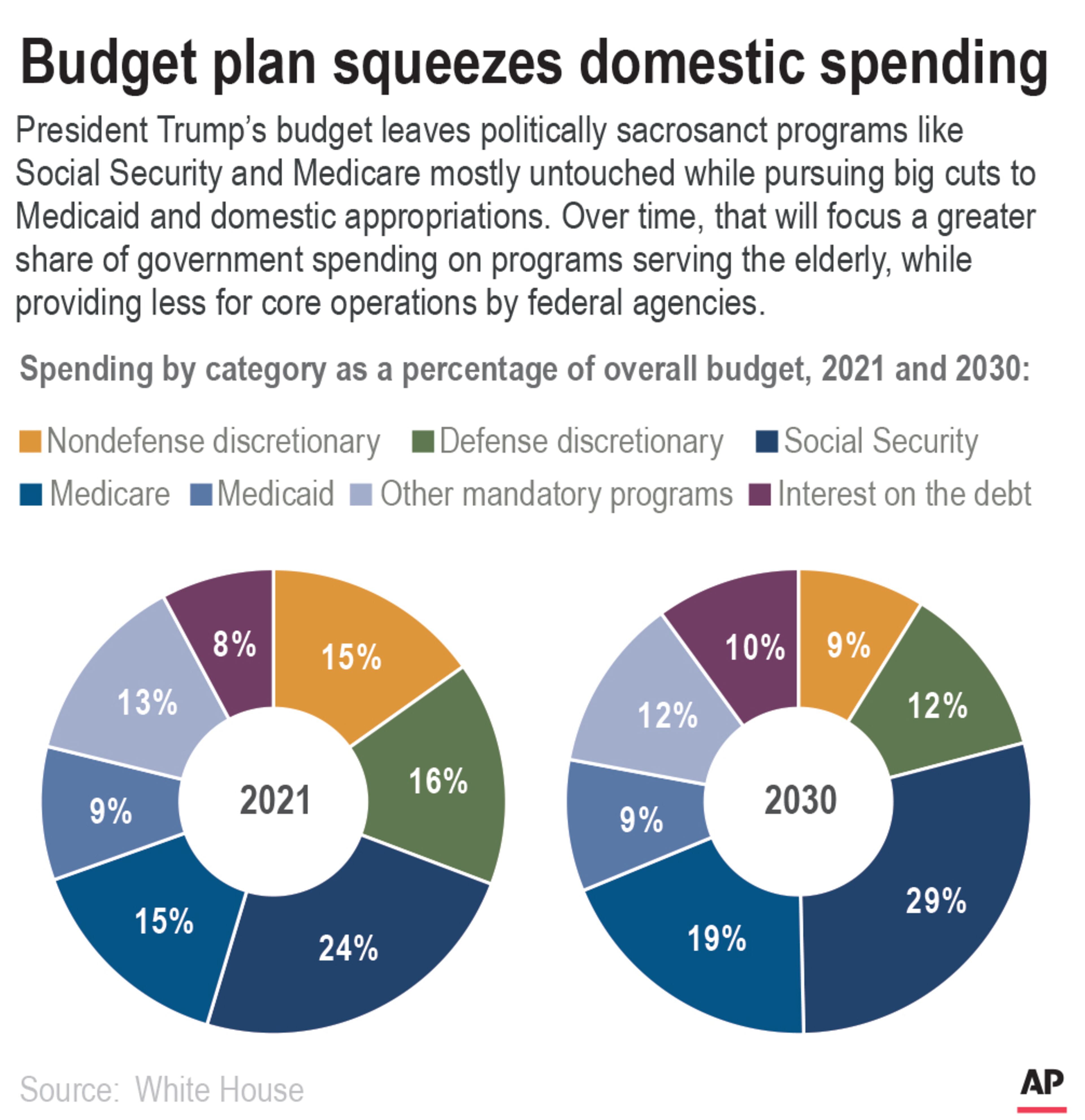 Trump’s $4.8 trillion budget proposal is slightly larger than last year’s $4.75 trillion request and calls for increased spending on the military, the border wall, infrastructure and other priorities, including extending the president’s 2017 tax cuts.