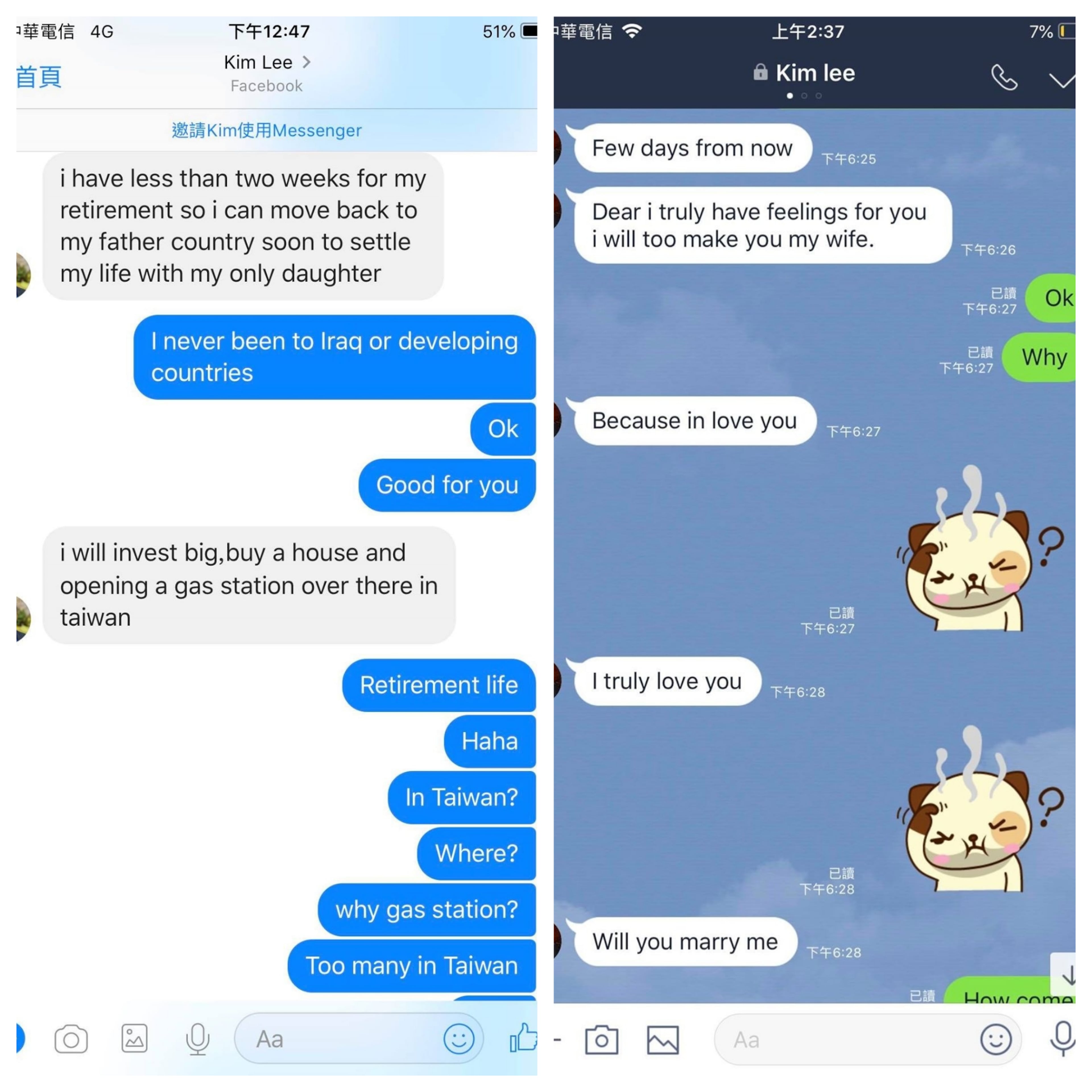 Another woman, Connie Lu, who lives in Taiwan, got a strange wedding proposal from a “Kim Lee.”