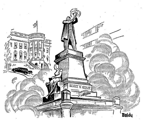 On the day before Carter took the oath of office, this cartoon below relayed a message of Atlanta’s pride in his election. It shows the statue of of early 20th century newspaper editor Henry Grady, which stands on Marietta Street in downtown Atlanta, waving in victory.