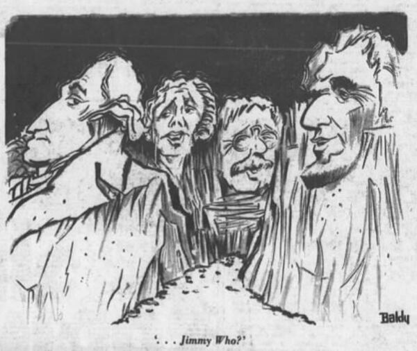 Carter seemed a long shot for president, and Baldy depicted the lonely former governor hitchhiking on an empty highway in an early cartoon.