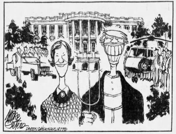 Mike Peters, editorial cartoonist for the Dayton Daily News, put Carter’s big grin as a major addition to the White House after Carter’s narrow election victory over Ford. Peters said this was one of his most-reprinted cartoons.