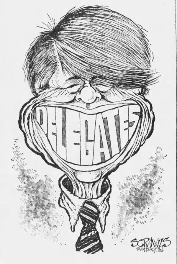 Sam C. Rawls, the cartoonist known as Scrawls, drew this cartoon above for the Palm Beach Post. It was also published in The Atlanta Constitution in May 1976, ahead of the Democratic National Convention.