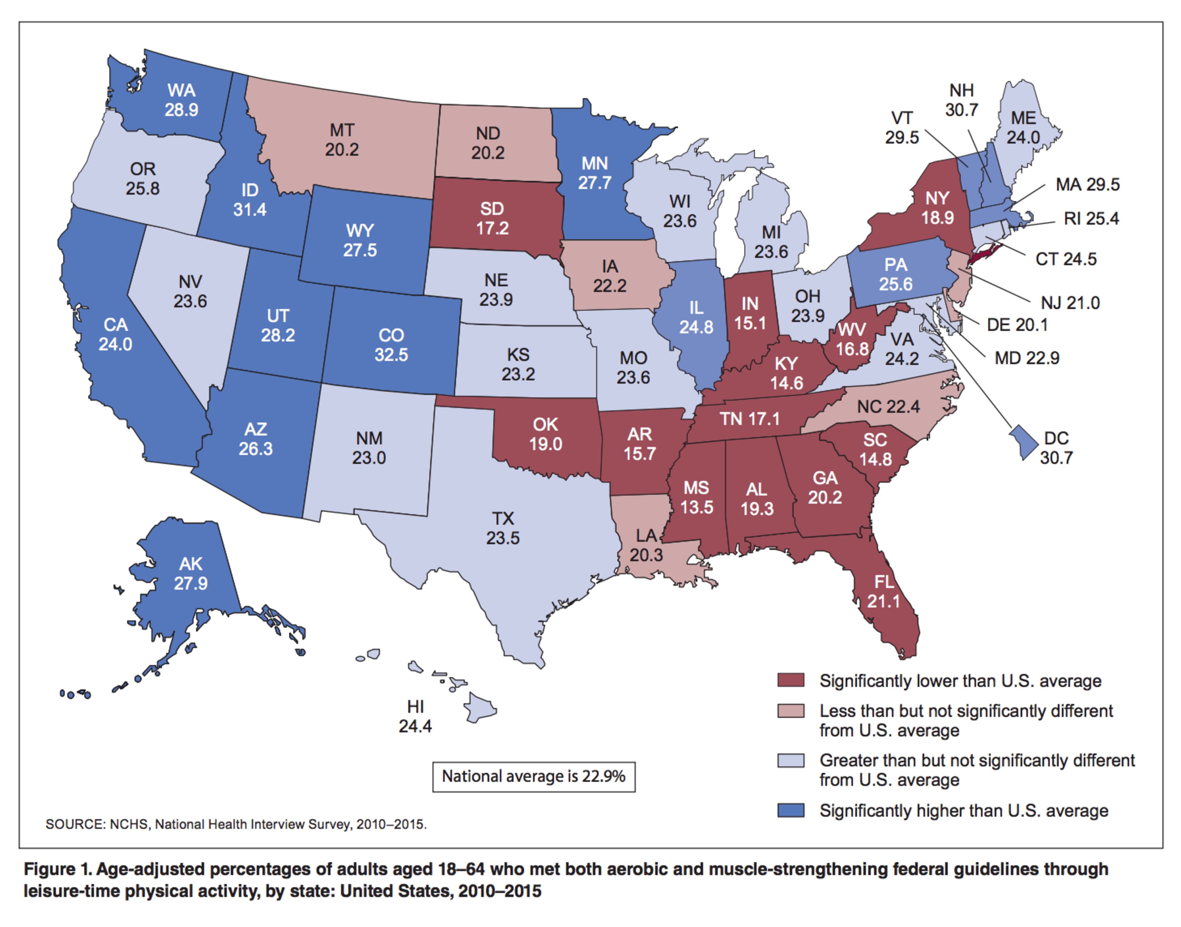 And in Georgia, only 20.2 percent of adults in the state met both aerobic and muscle-strengthening federal guidelines between 2010-2015.