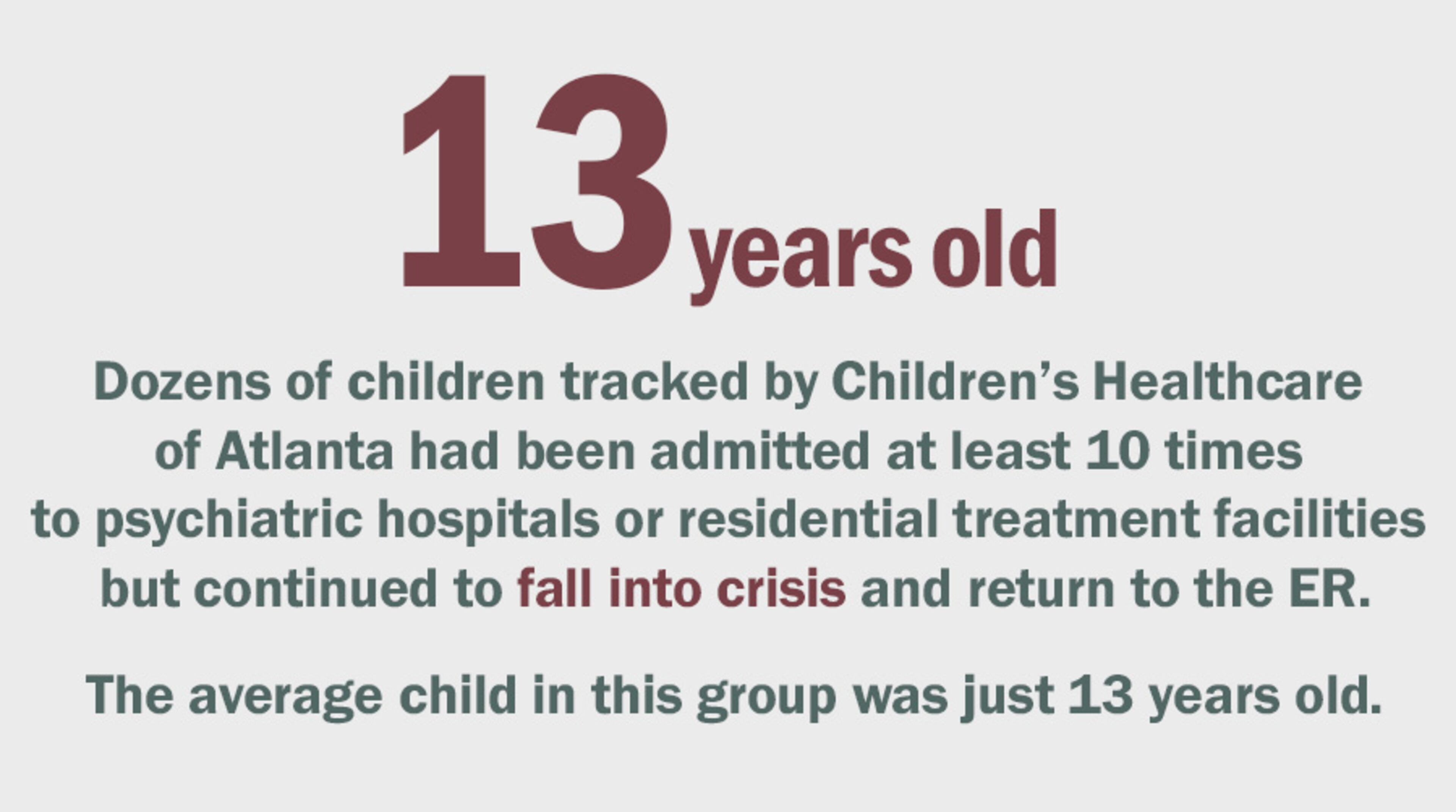 But Children’s, which doesn’t have inpatient psychiatric beds, noticed that many kids sent away for treatment soon were back in its ERs. Dozens of these children tracked by the system had been admitted at least 10 times to psychiatric hospitals or residential treatment facilities but continued to fall into crisis and return to the ER.