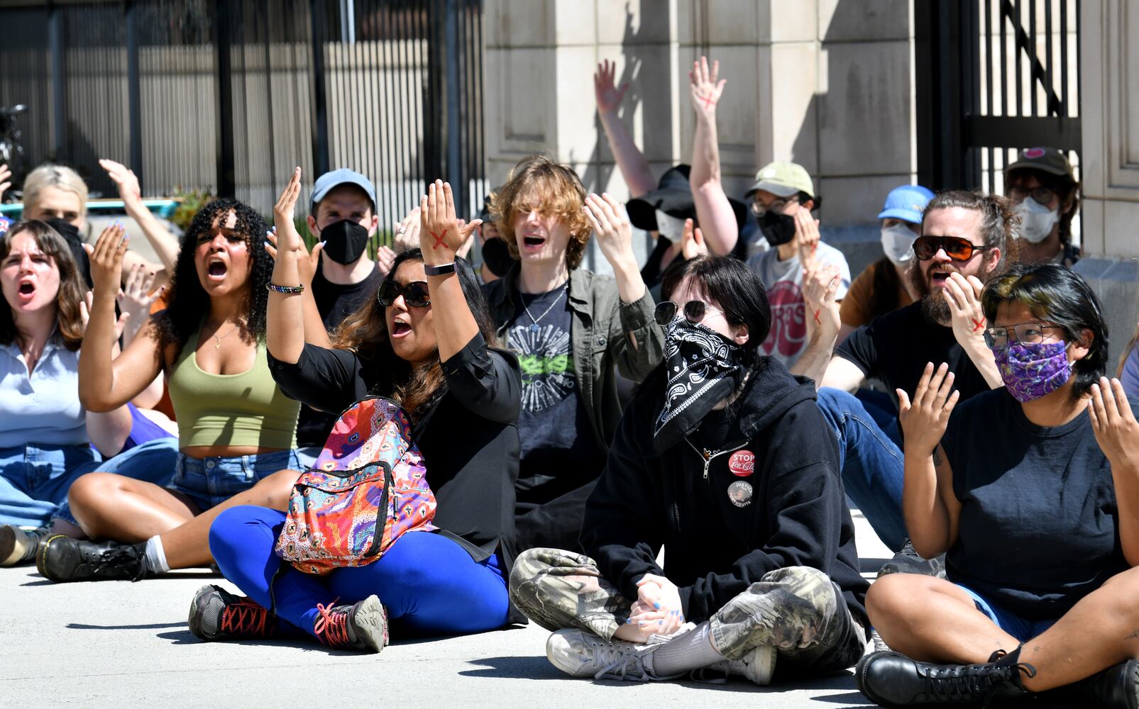 People gather near the Georgia Capitol in remembrance of Manuel Tortuguita Terán, the environmental activist killed by state troopers at the planned site of the public safety training center.