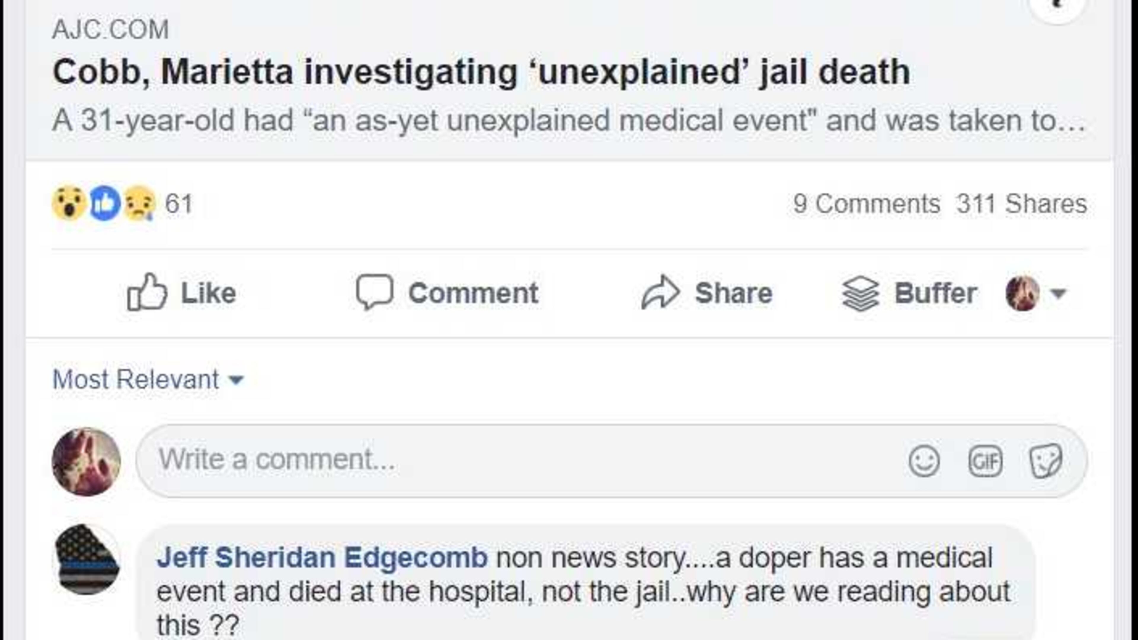 Jeff Edgecomb posted the comment on The Atlanta Journal-Constitution’s Facebook page under an article titled, “Cobb, Marietta investigating ‘unexplained’ jail death” about the death of 31-year-old Jessie Myles.