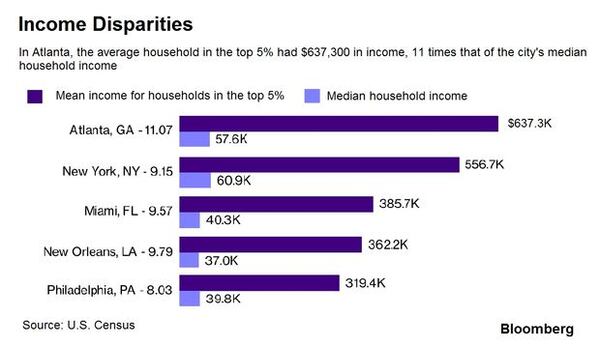 A new Bloomberg analysis based on U.S. Census Bureau calculations and the distribution of household income ranks Atlanta the most unequal large city in the United States.