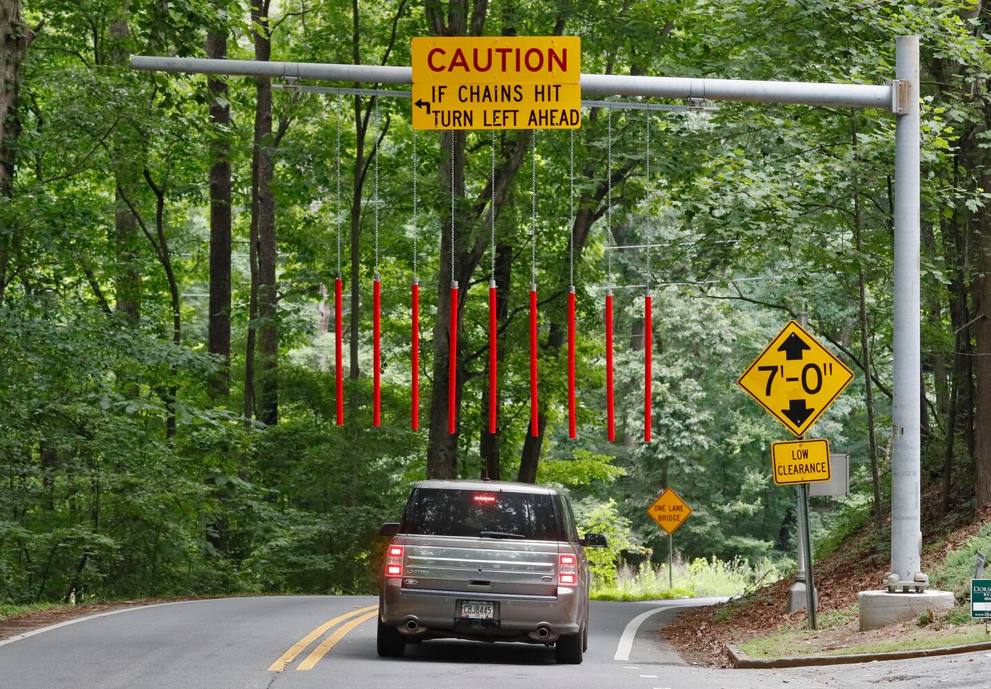 June 20, 2019 - Smyrna - Roberto Jorge (left), and Clifford Blakely, Cobb DOT workers, works on installing signage on the mast. Cobb County is rolling out yet another tool designed to warn drivers of the seven-foot clearance of the Concord Road covered bridge. The county has installed mast arms along Concord Road that will have plastic-covered PVC pipes suspended at seven feet. If a too-tall vehicle hits these pipes, they should not try to pass through the covered bridge. Bob Andres / bandres@ajc.com