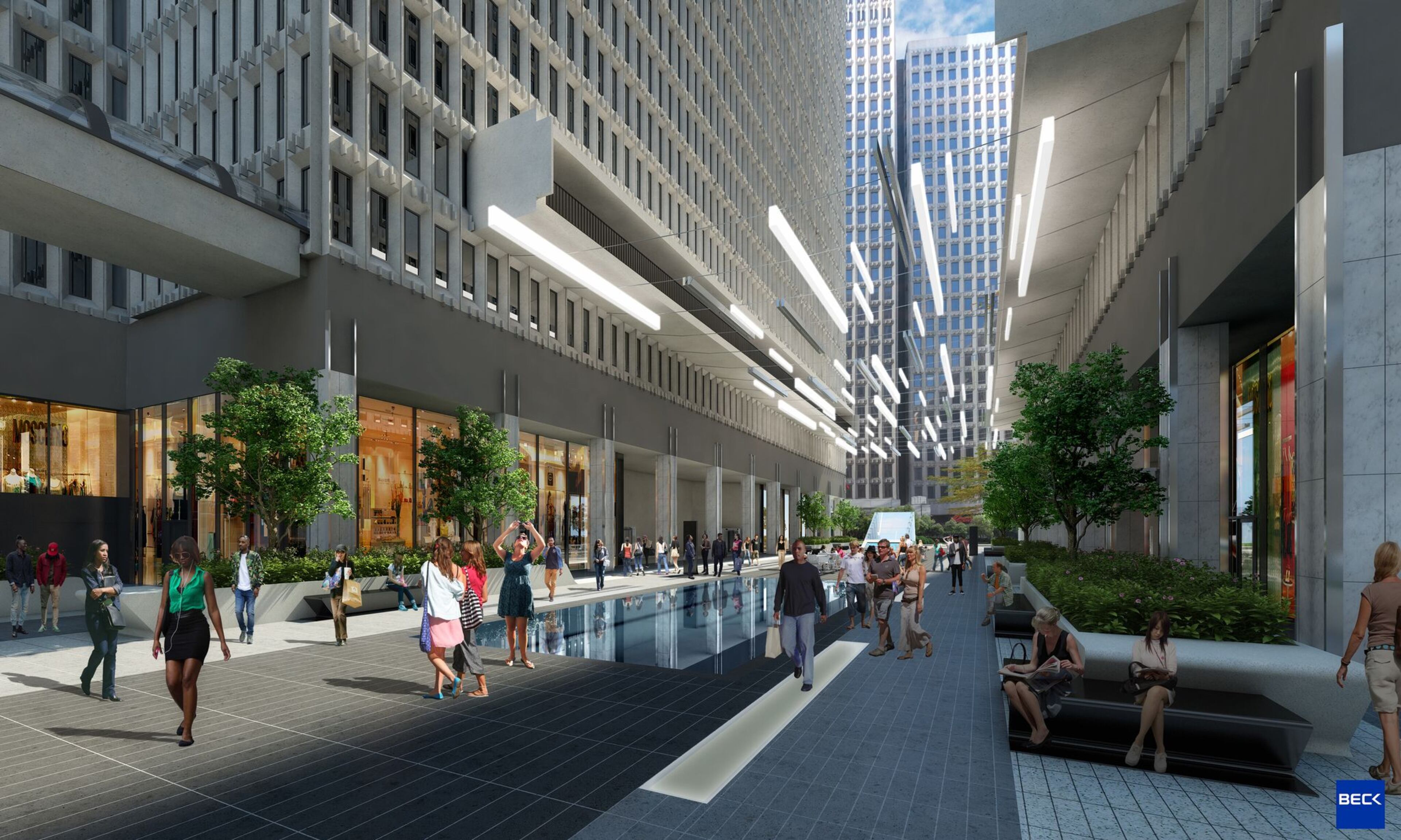 The redesigned courtyard will include a glass-enclosed staircase, reflective pools with seating and a “suspended canopy of linear lighting elements ... that will be especially stunning at night,” the news release said.