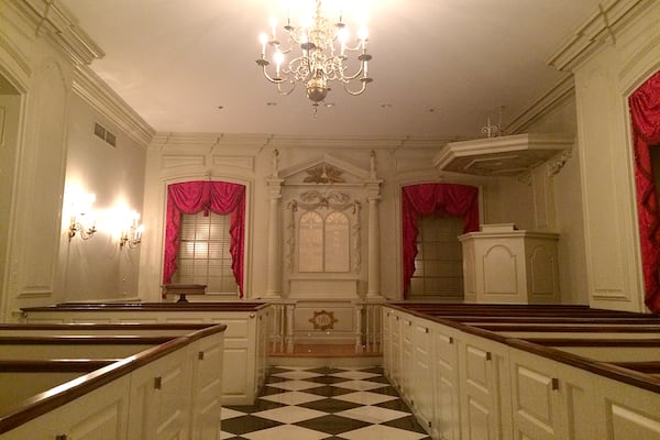 Nineteen box pews featuring hymnal holders and kneeling pads face an ornate raised pulpit and a chancel with the Ten Commandments in gold leaf. A small pipe organ is squeezed into the back and the surrounding walls are decorated with chandeliers and windows with brocade drapes. The overall effect is to be transported from the grittiness of Jesse Hill Drive to a quiet, well-appointed country church.