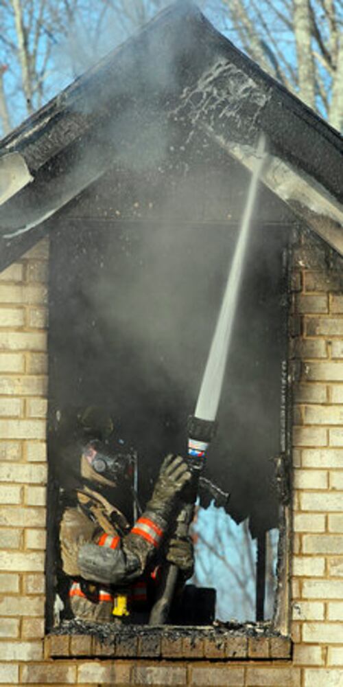A Clayton County firefighter emerges from inside the home to address another flare up on the rear of the house Monday during a morning blaze on Bouldercrest road. No one was home when the fire broke out, and no one was injured. The home, though, was a total loss.