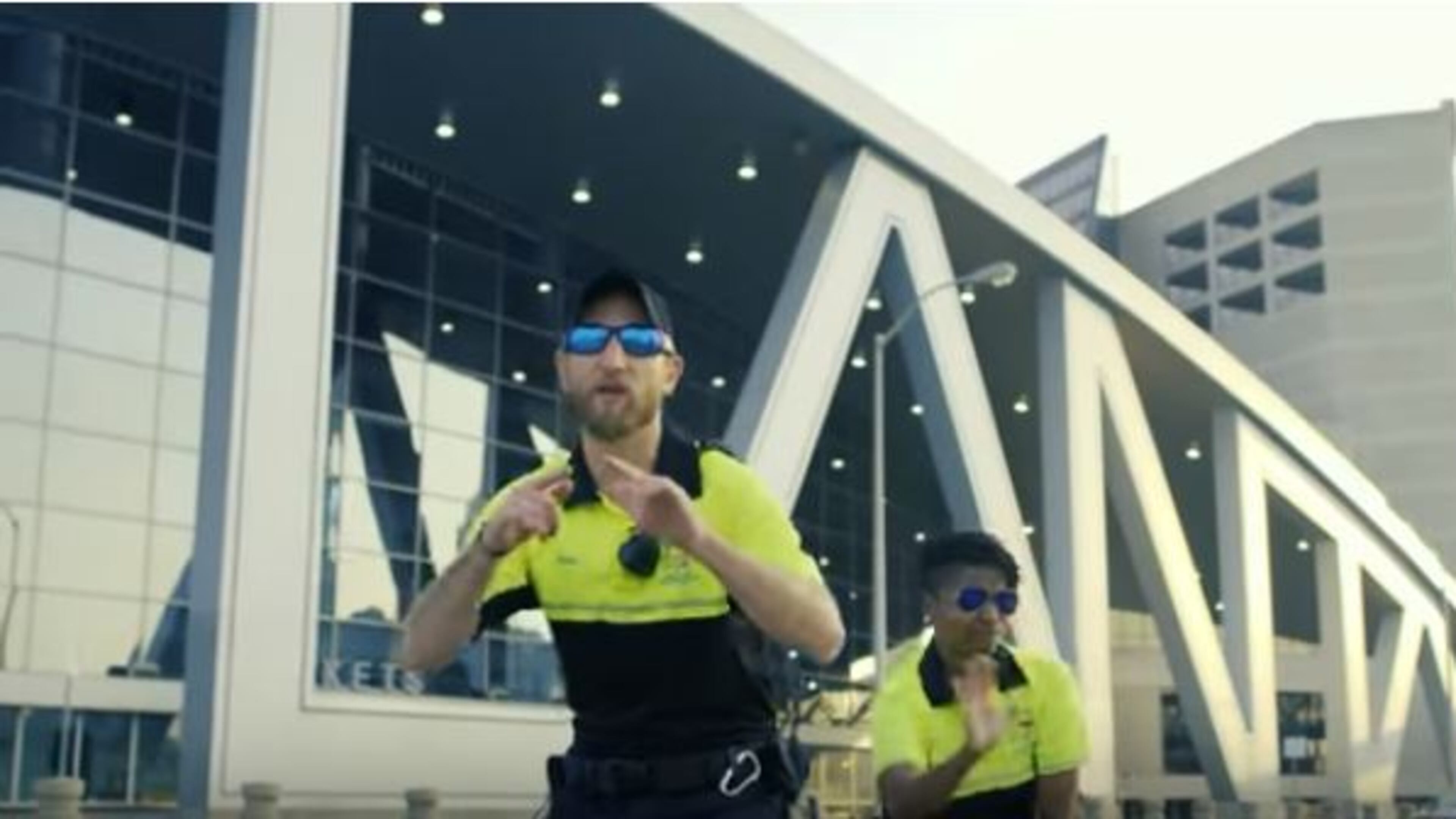 The Grady video begins with shots of the city, followed by lip syncing to Jermaine Dupree's "Welcome to Atlanta," featuring Ludacris. The scene changes to the dispatch area, where dozens of employees dance and "sing" to Outkast's wildly popular "Hey ya," written by André Benjamin as ambulance lights flash and confetti falls.