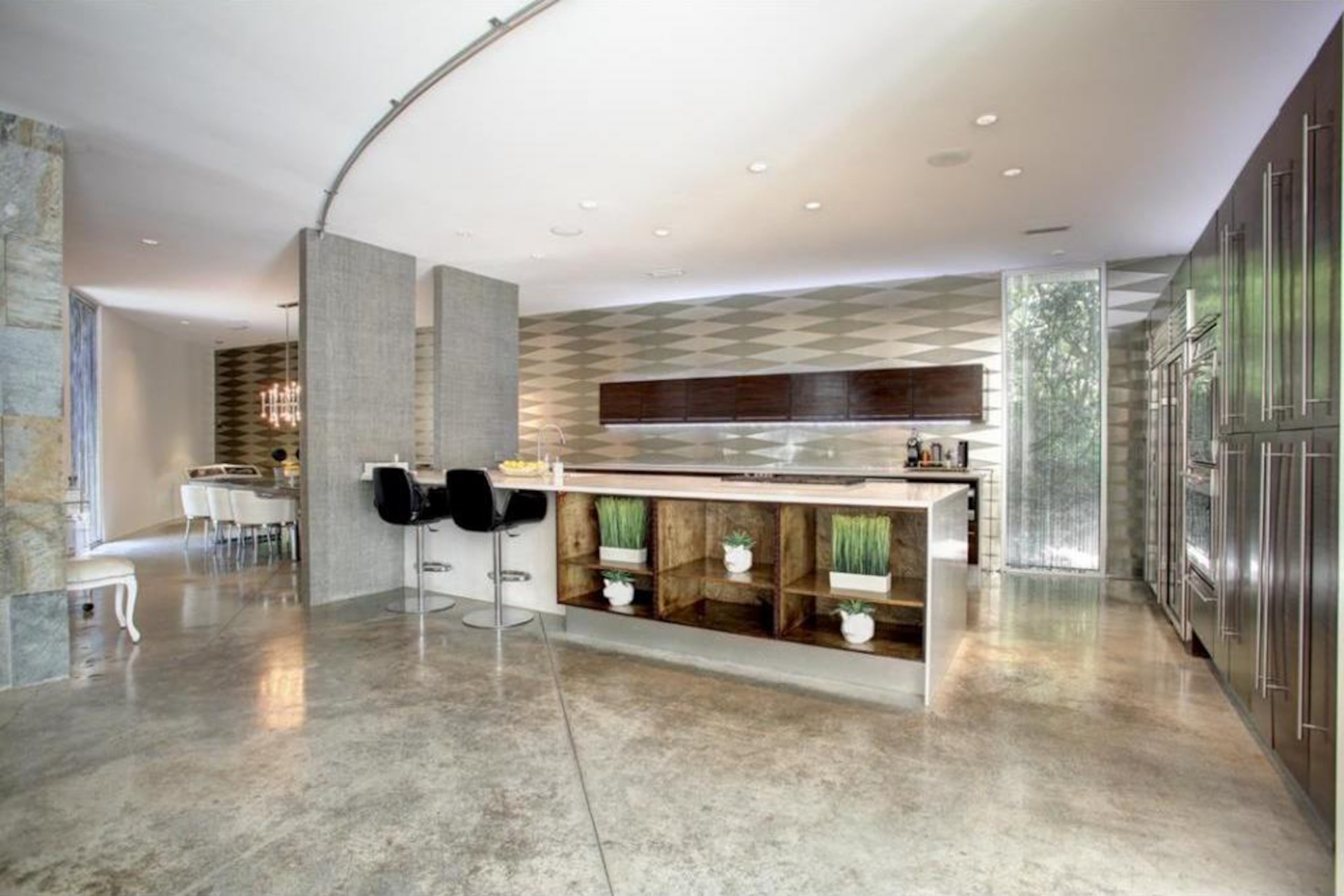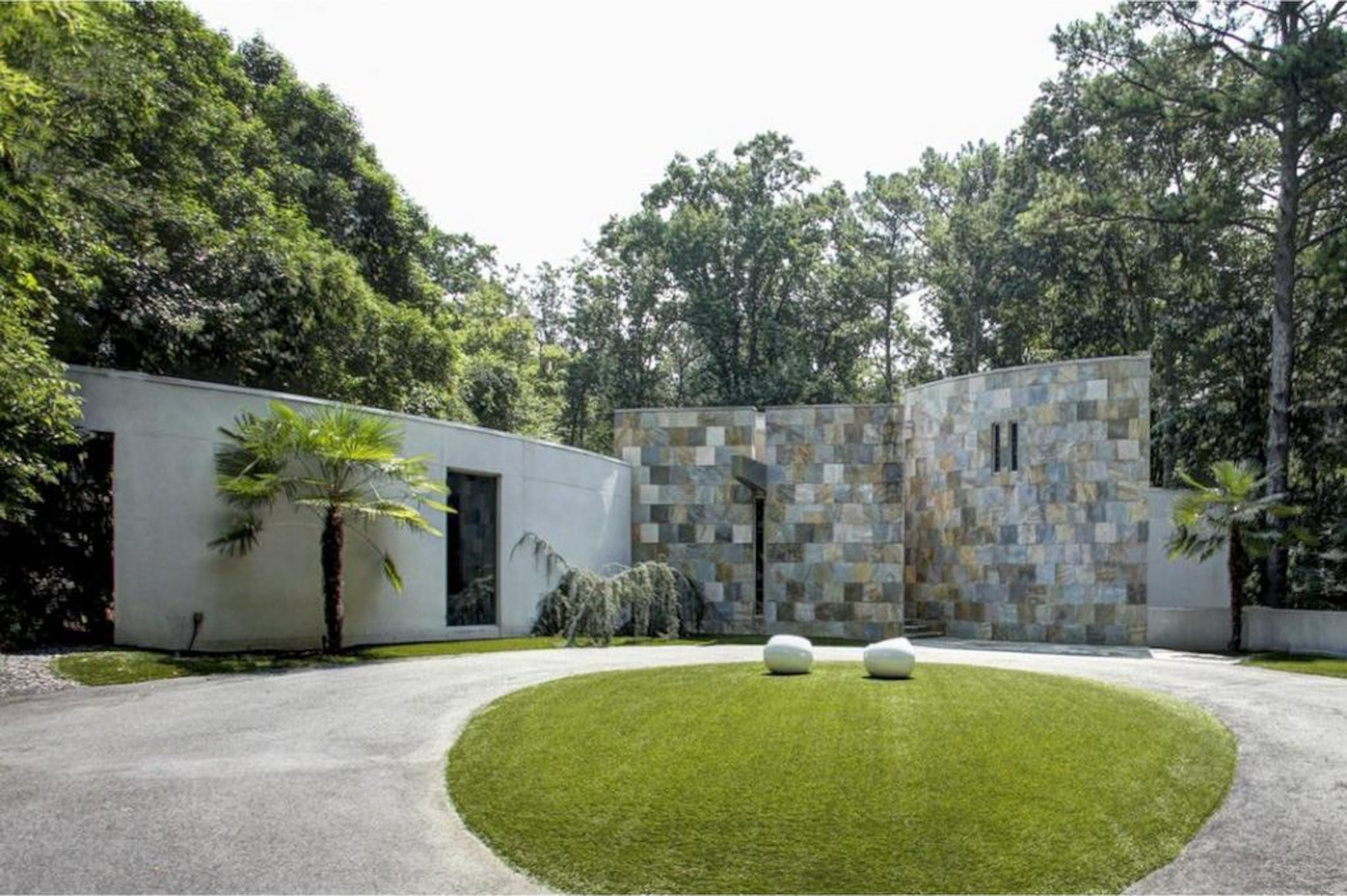 Don’t let the unassuming size of the front of the circa-2006 home deceive you. What looks like an artistic wall with trees behind it actually guards a 5,345-square-foot manor with 10-foot ceilings, five bathrooms and four bedrooms.