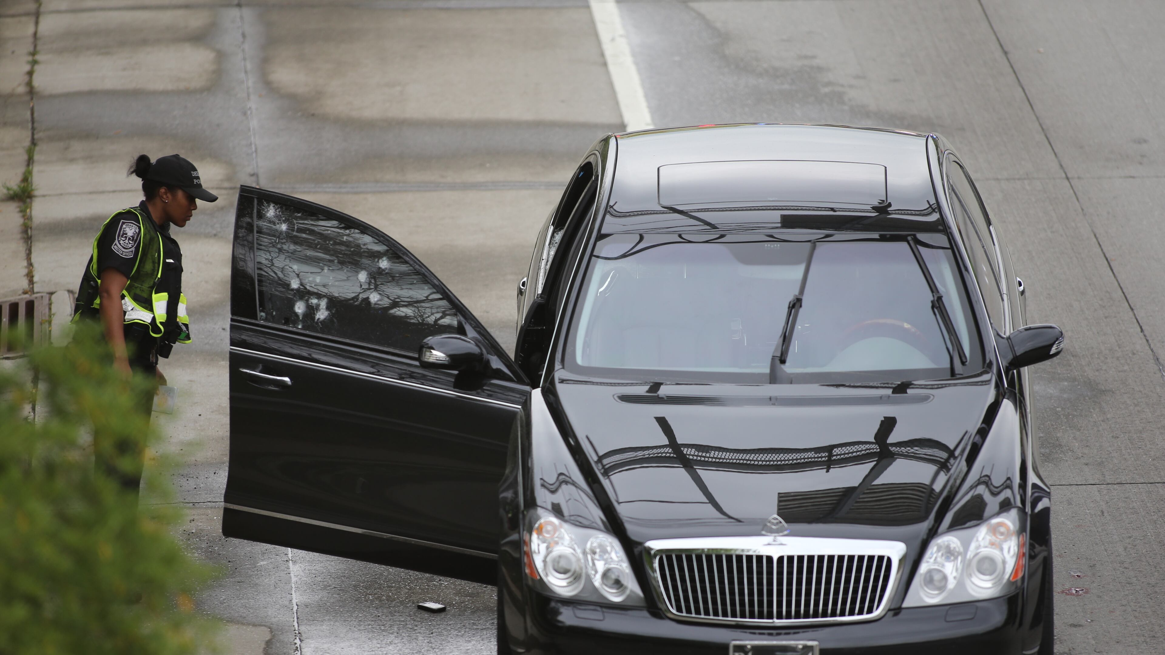 The car, which has a Florida license plate, was damaged from multiple gunshots, and police recovered shell casings along the interstate.