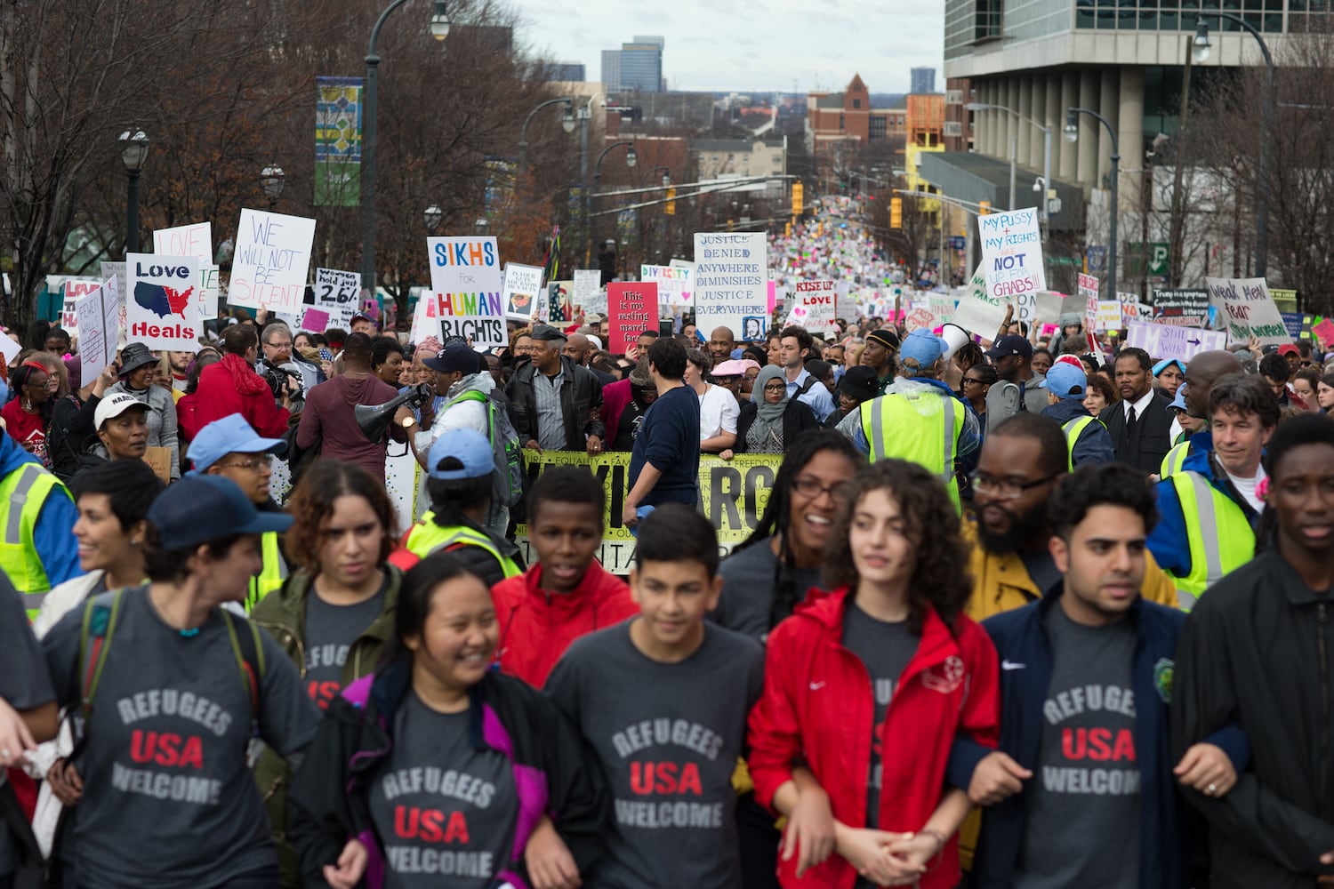 An estimated 60,000 people march in downtown Atlanta in solidarity with the Women's March in Washington, D.C.