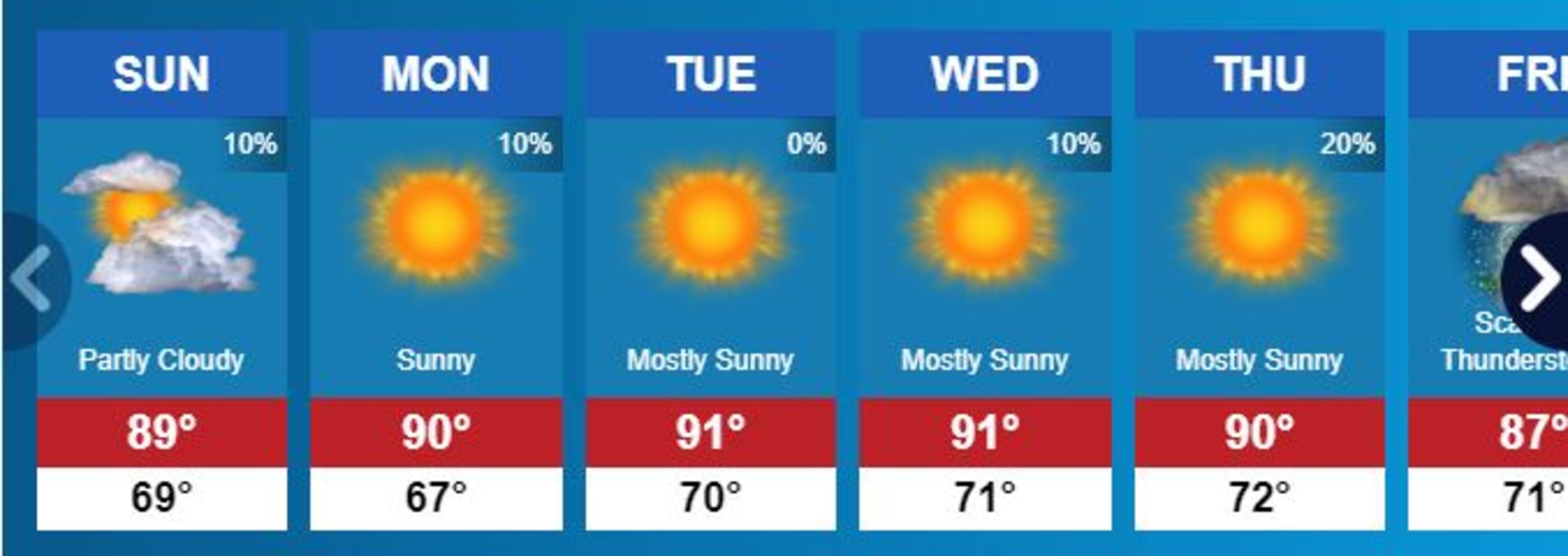 Channel 2 Action News meteorologists say there’s little chance of rain until the end of the week. Sunny skies are predicted until at least Thursday. High temperatures will be near 90 and overnight lows around 70.