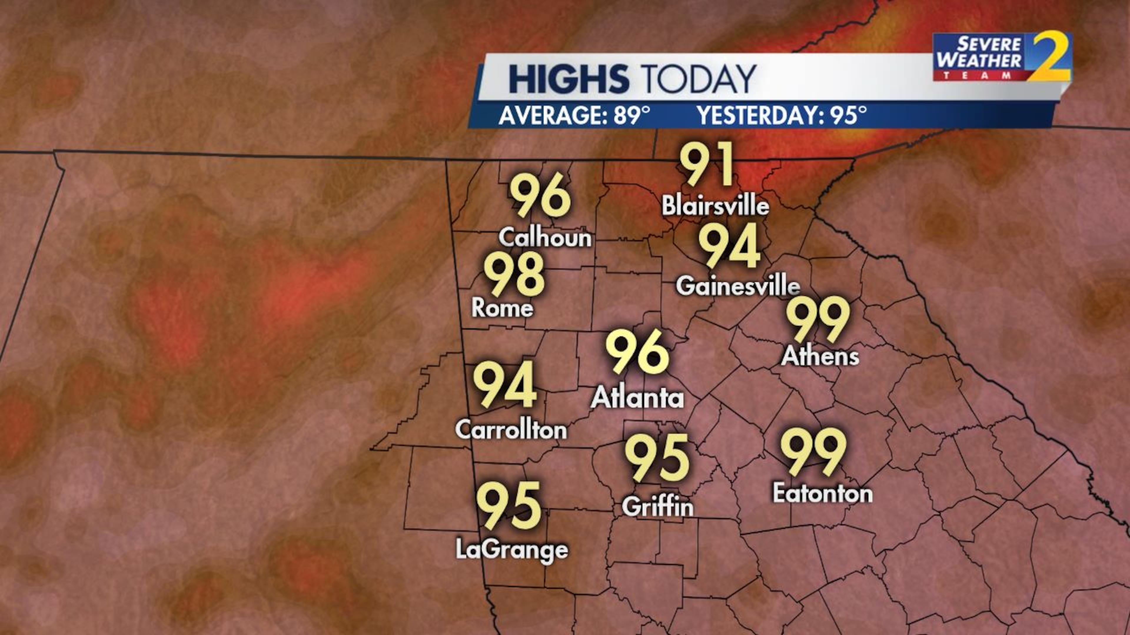 “It’s going to feel like triple digits this afternoon,” Monahan said. “By lunchtime today, it feels like close to 100 in Calhoun, Eatonton and Athens.”