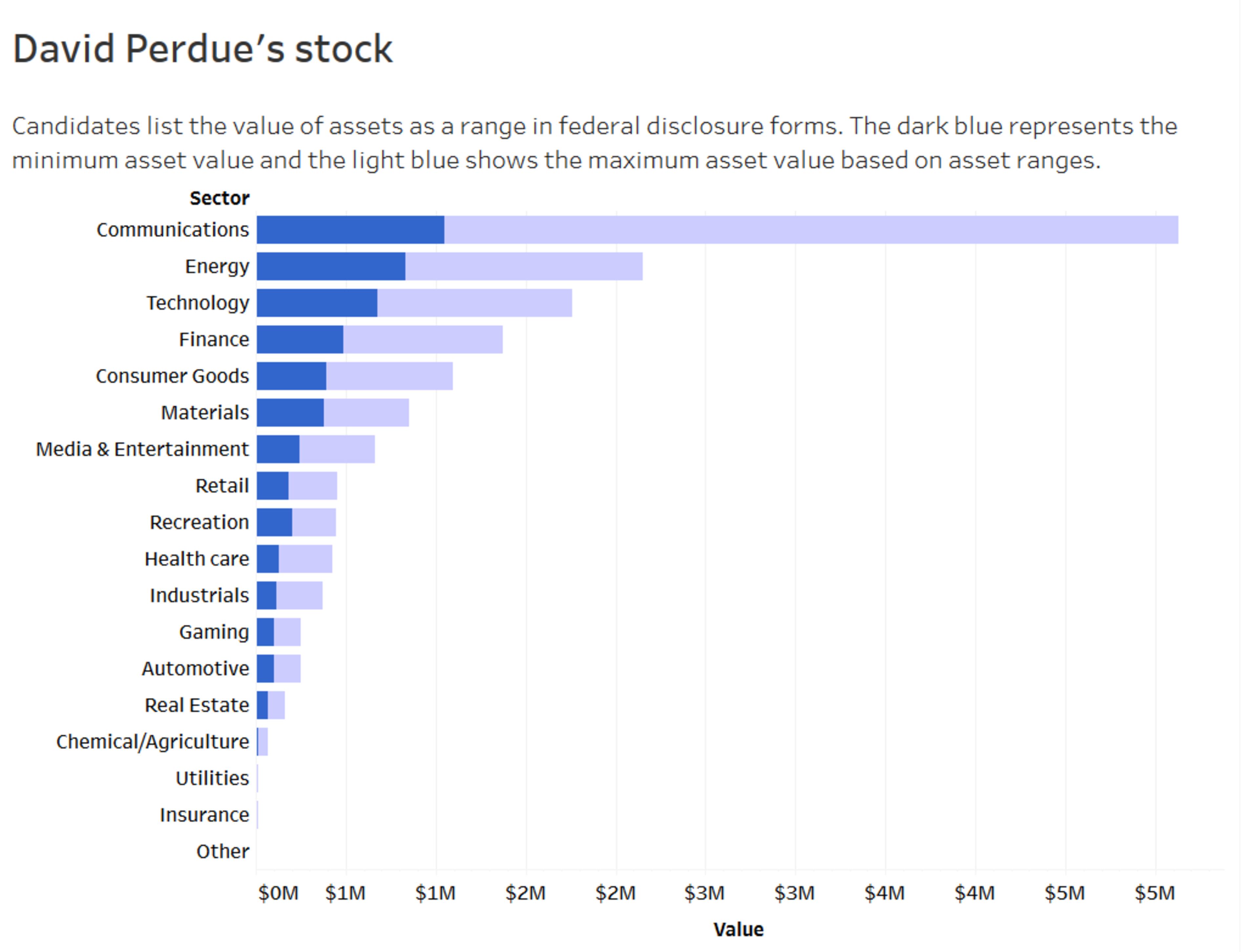 The challenger most like Perdue from a wealth perspective is Jon Ossoff, who has reported a net worth of between $2.3 million and $8.6 million. While a large chuck of that net worth is tied up in the value of his documentary film company (which he estimates to be worth between $1 million and $5 million), Ossoff also reported a significant stock portfolio valued between $753,000 and $1.7 million.