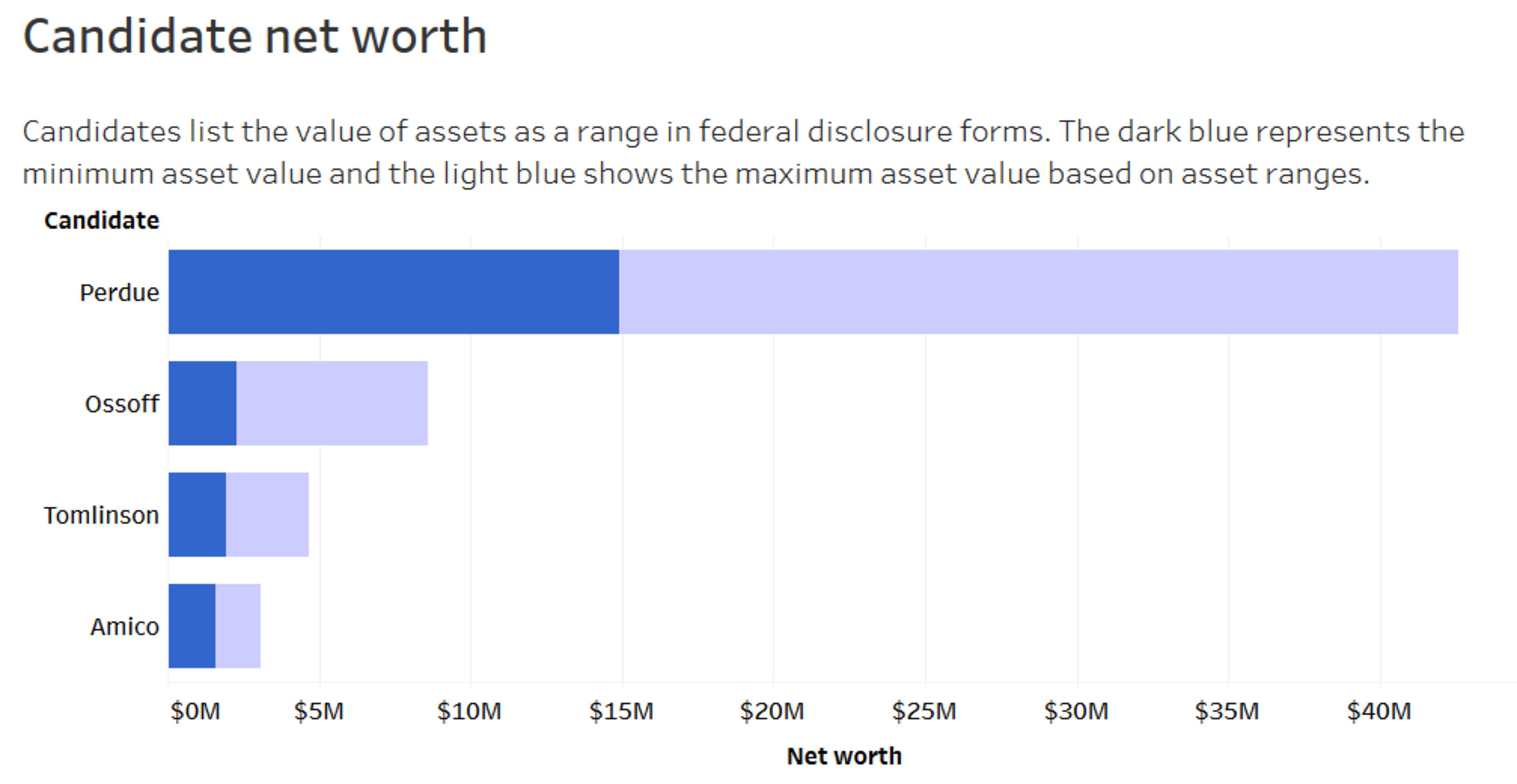 According to an AJC analysis of his most recent filing, Perdue’s net worth is somewhere between $14.9 million and $42.6 million. The fuzzy math is due to Senate reporting requirements that allow candidates to report a value range for each individual holding, like stocks and bonds, and Perdue has a lot of both.