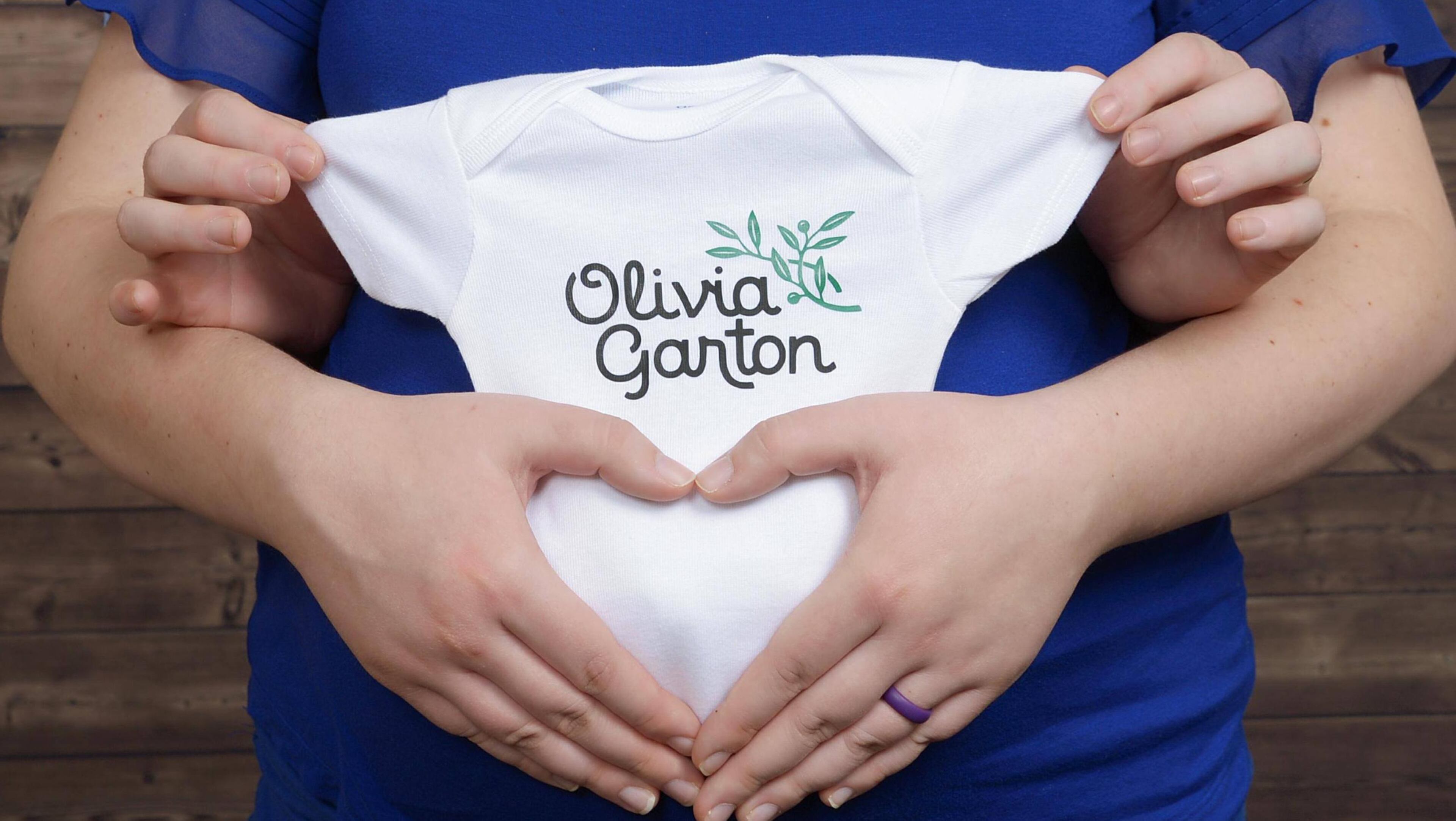 A friend took the joke a step further, making the couple and new baby a onesie with “Olivia Garton” in the style of the famous restaurant’s logo.