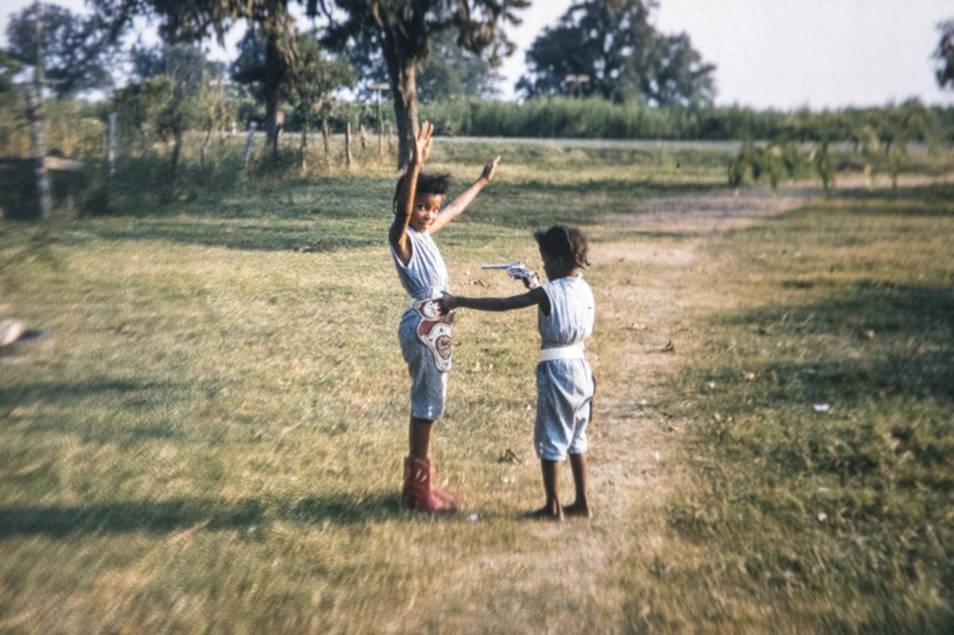 There are no pictures of people in uniforms, but there’s a cultural clue that suggests that might be the case: The family is African-American but some of their photos show black and white kids playing together.