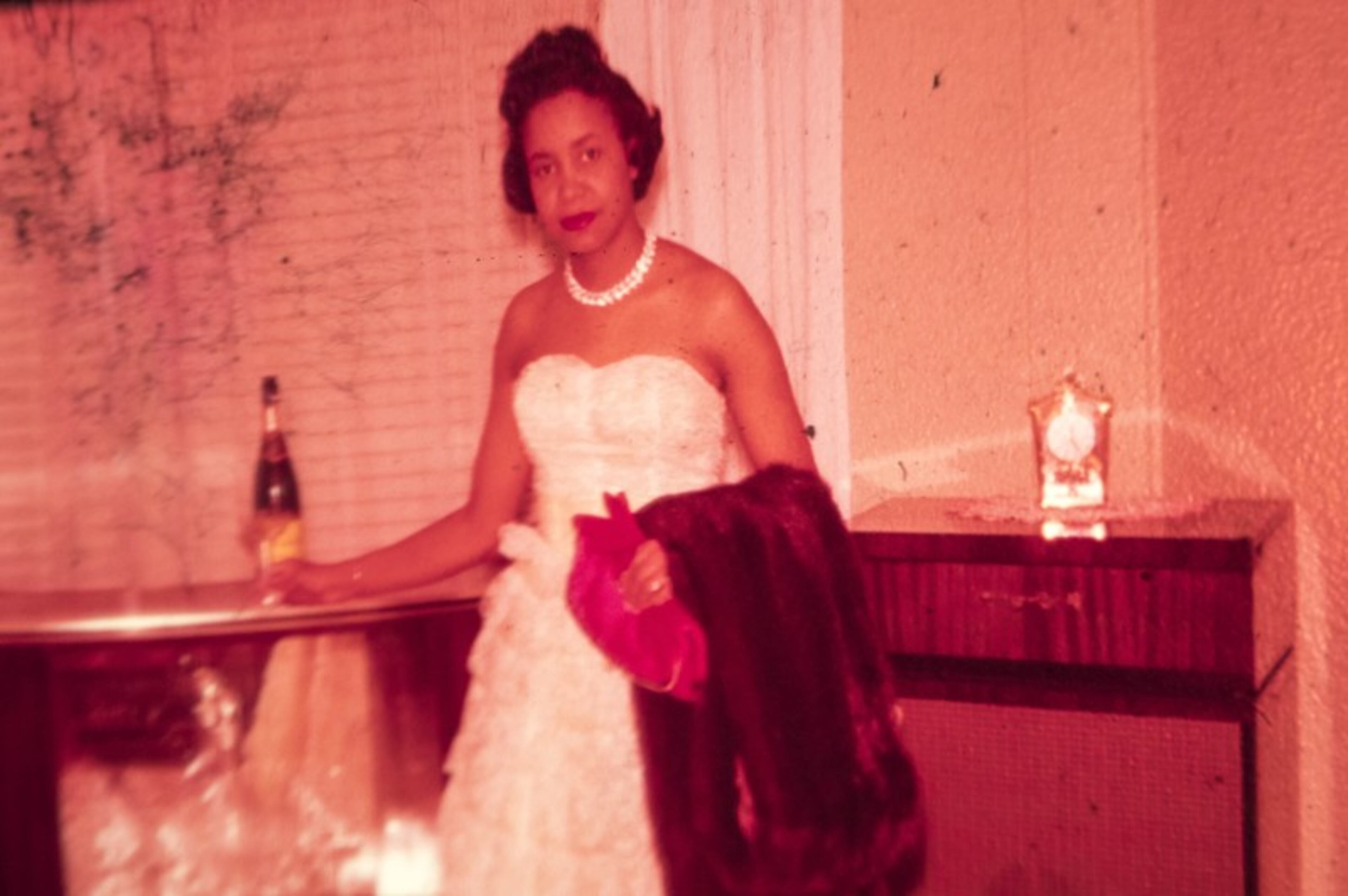 The lady of the house dazzles in a strapless evening gown, pink gloves and glittery choker. There's a champagne coupe in her right hand — Veuve Cliquot, it appears from the label behind her — and a mink stole drapes over her left arm. Where did she go that night?