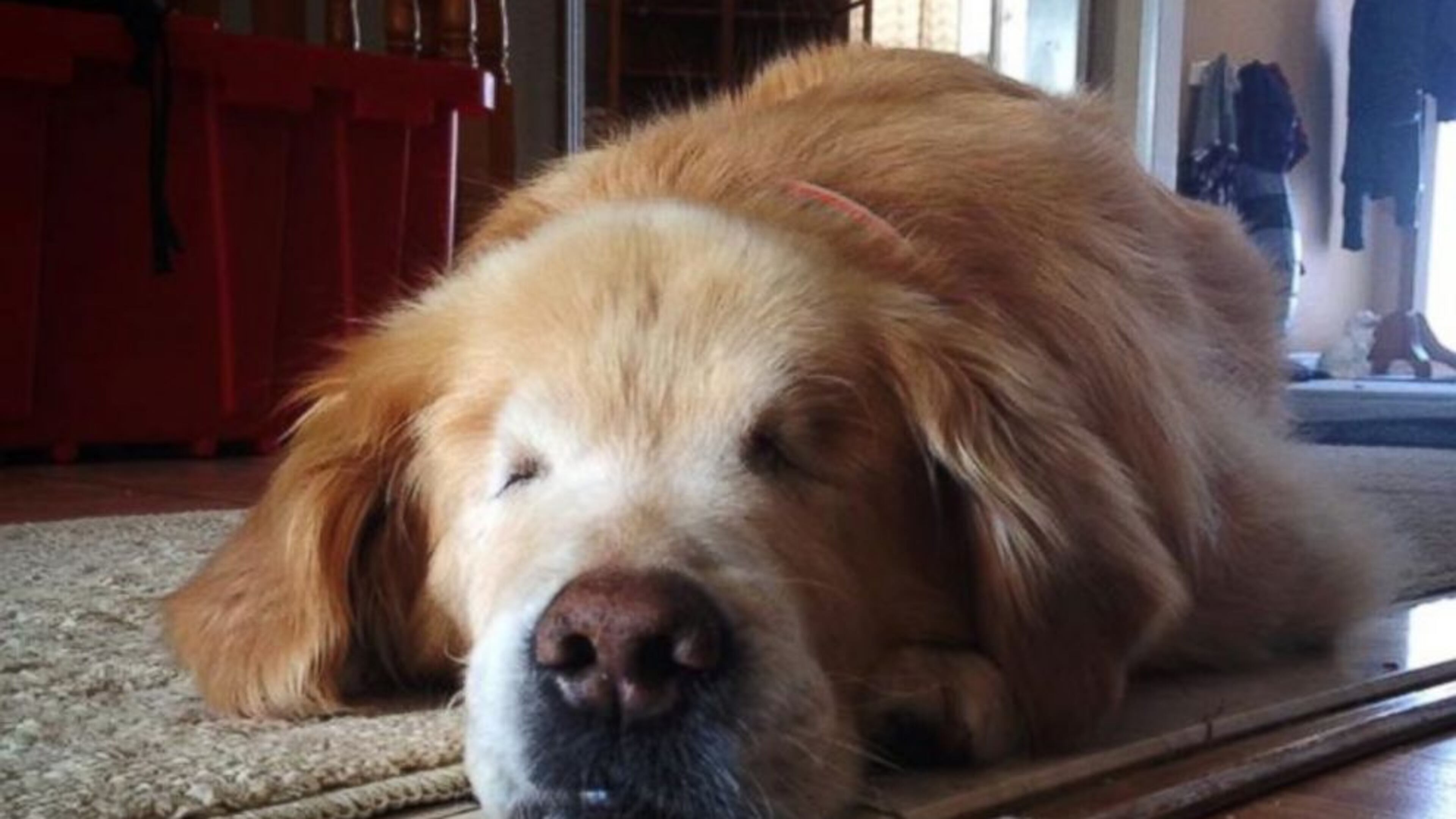 The dog was rescued from a puppy mill around age 1 or 2 by owner Joanne George. During his interview on GMA, George said that because the Golden Retriever was born without eyes, he began his life terrified to go outside the barn he lived in.