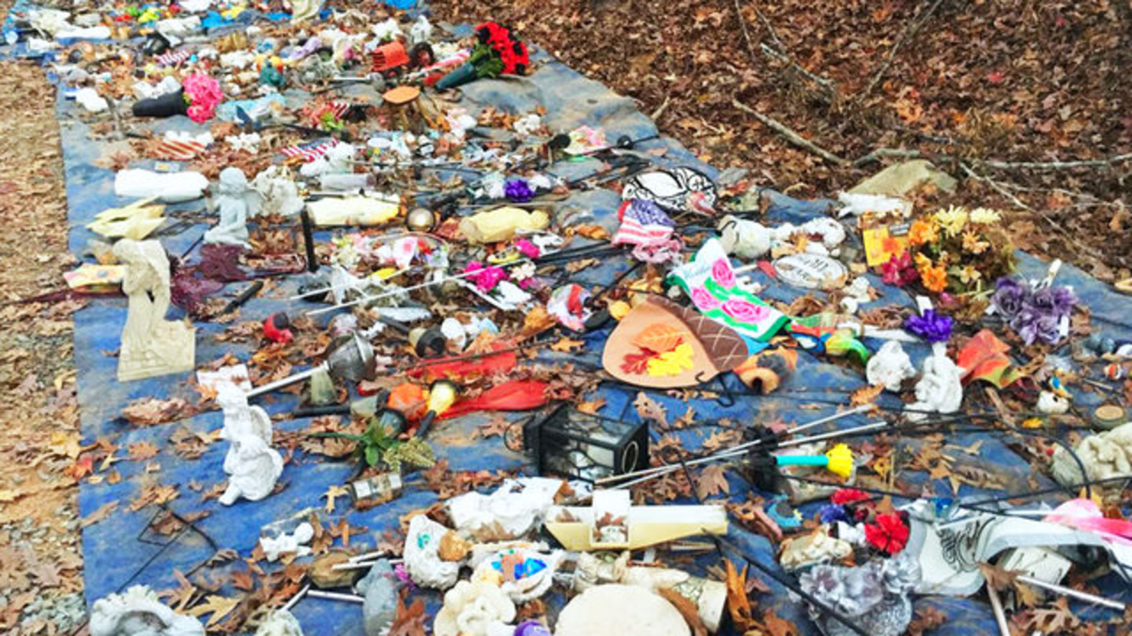 Ellen Jackson, whose son was buried at the site in 2015, said she found a butterfly, a small helmet and other items that were on his headstone among dozens of other items that were laid out on a tarp.