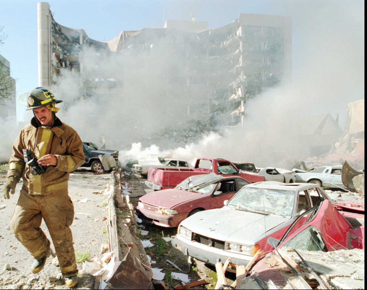 In this April 24, 1995 file photo, an Oklahoma City police car decorated with the words, "We will never forget," and a small American flag sits near the Alfred P. Murrah Federal Building in Oklahoma City. The blast killed 168 people _ including 19 children _ injured hundreds more and caused hundreds of millions of dollars in damage to structures and vehicles in the downtown area. (AP Photo/Rick Bowmer, File)