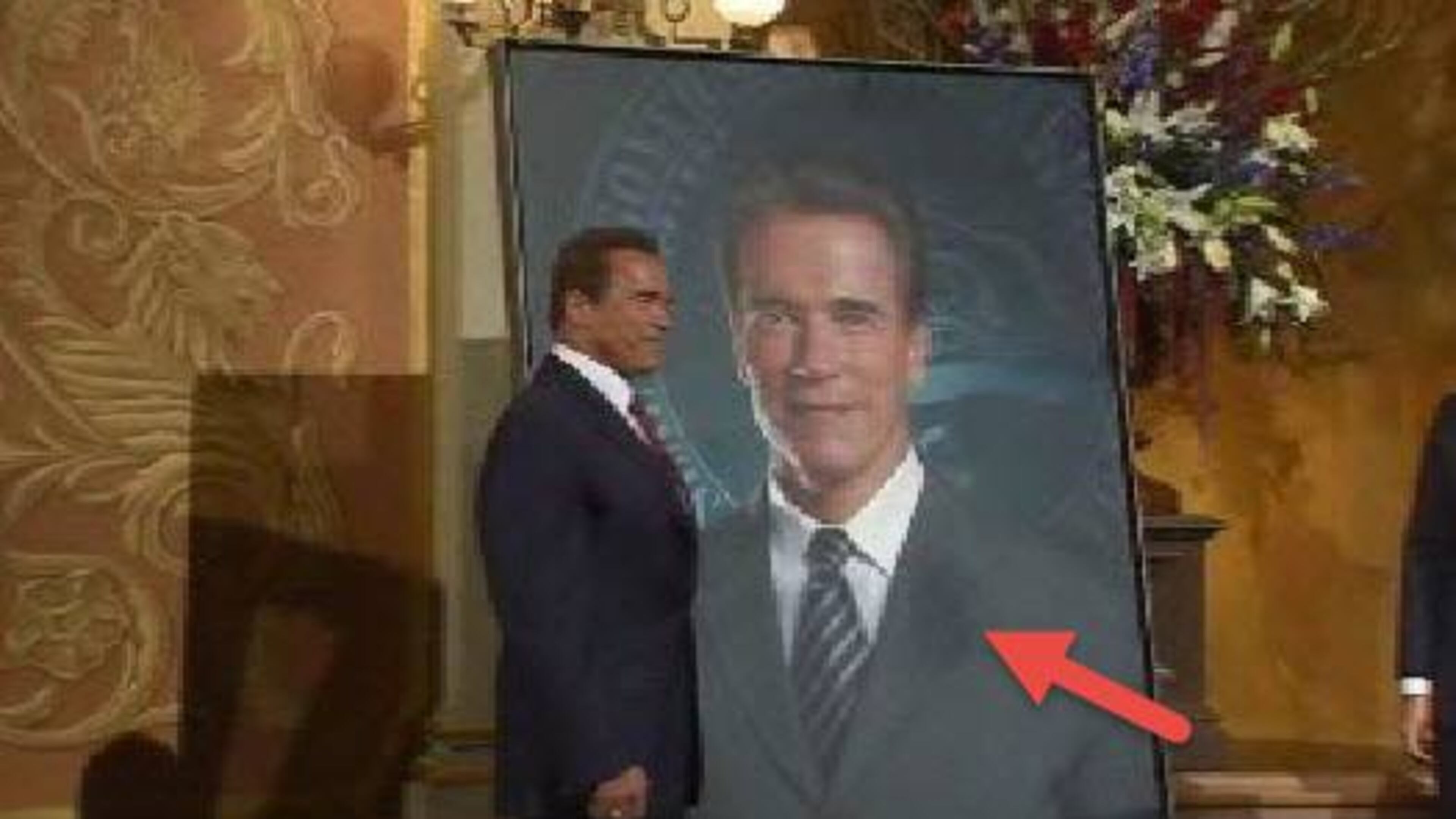 The newly installed portrait of former governor Arnold Schwarzenegger at the State Capitol is drawing some attention for something it's missing.