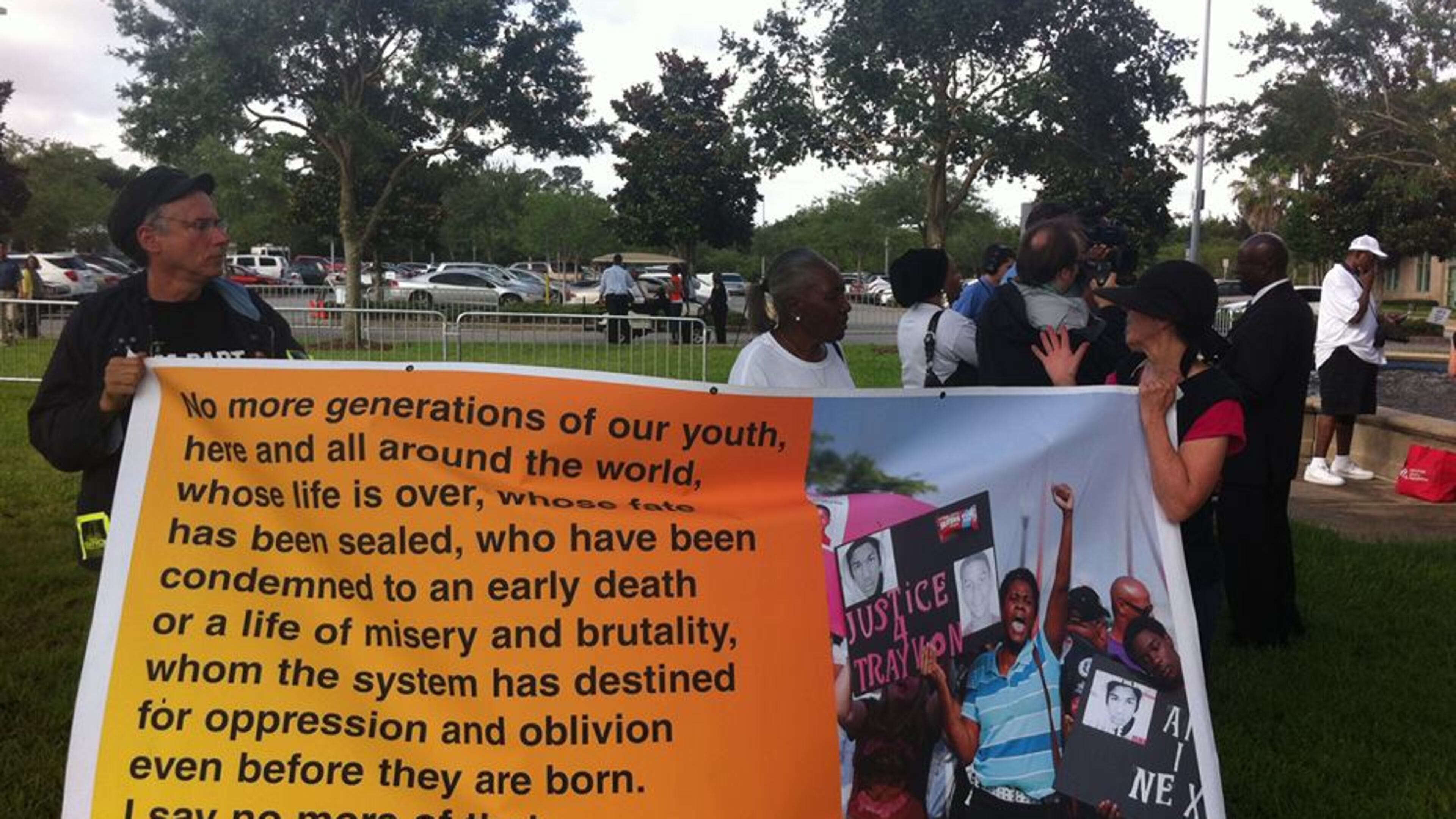 About two dozen protesters have also been making their voices heard, chanting outside the courthouse “The whole system is guilty, Trayvon did not have to die, we all know the reason why.”