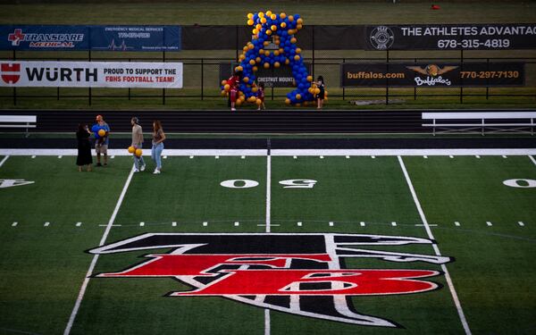 In Flowery Branch, jerseys and T-shirts from Apalachee, Mountain View and Haralson County high schools — where Aspinwall has taught and coached — mixed in with many professional and college teams. An “A” made from blue and yellow balloons made a colorful backdrop to what could have been a somber event, but decidedly wasn’t.