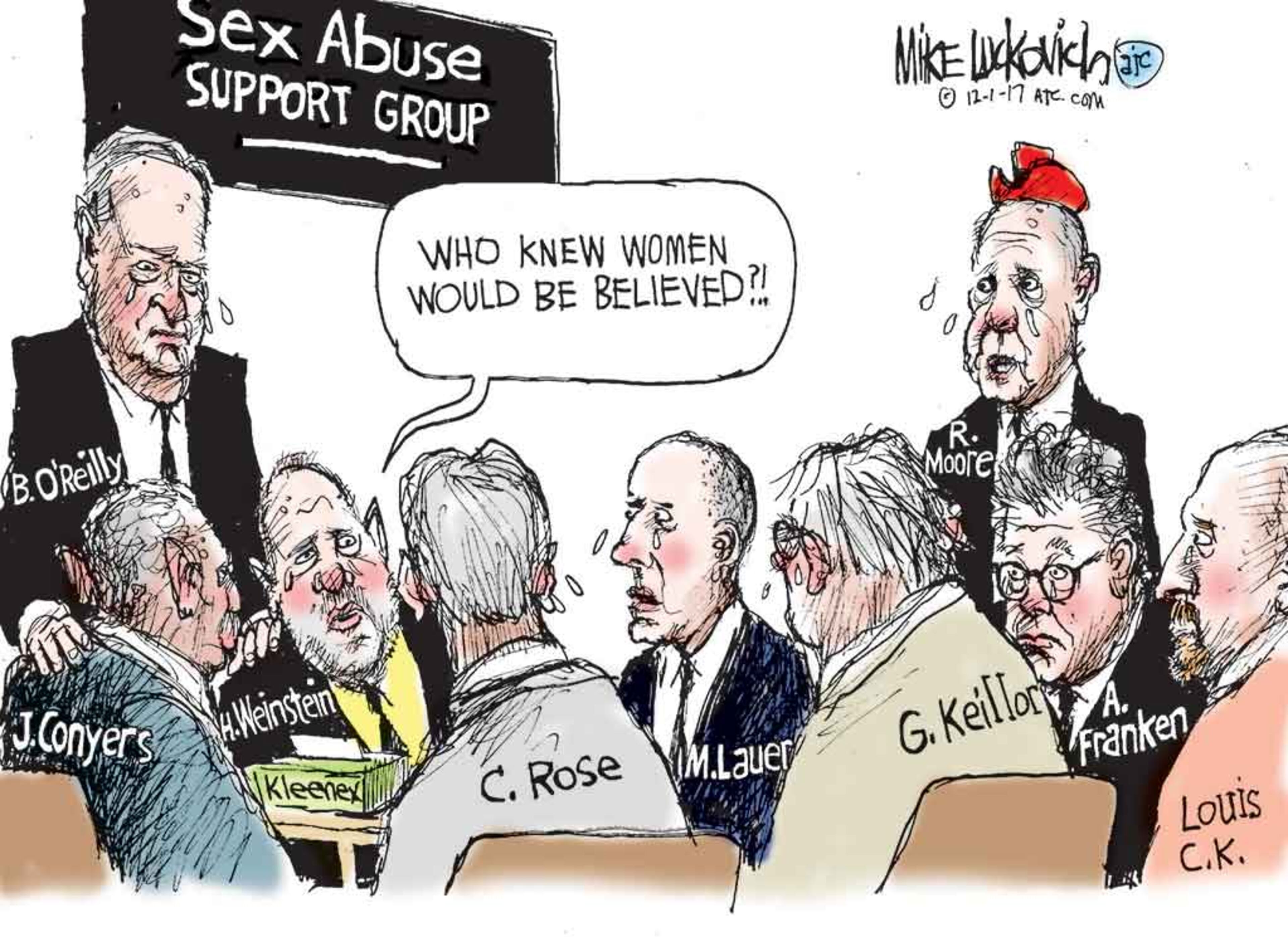 "This is just a revolution that's happening. Women are finally being listened to when it comes to sexual harassment. I think it's a great thing. It's really ensnared men, both on the right and on the left, as I show in this cartoon. And I don't think it will slow down anytime soon. My hope is that all of this is going to force men to be respectful, and to realize there's a price to be paid for being pigs."