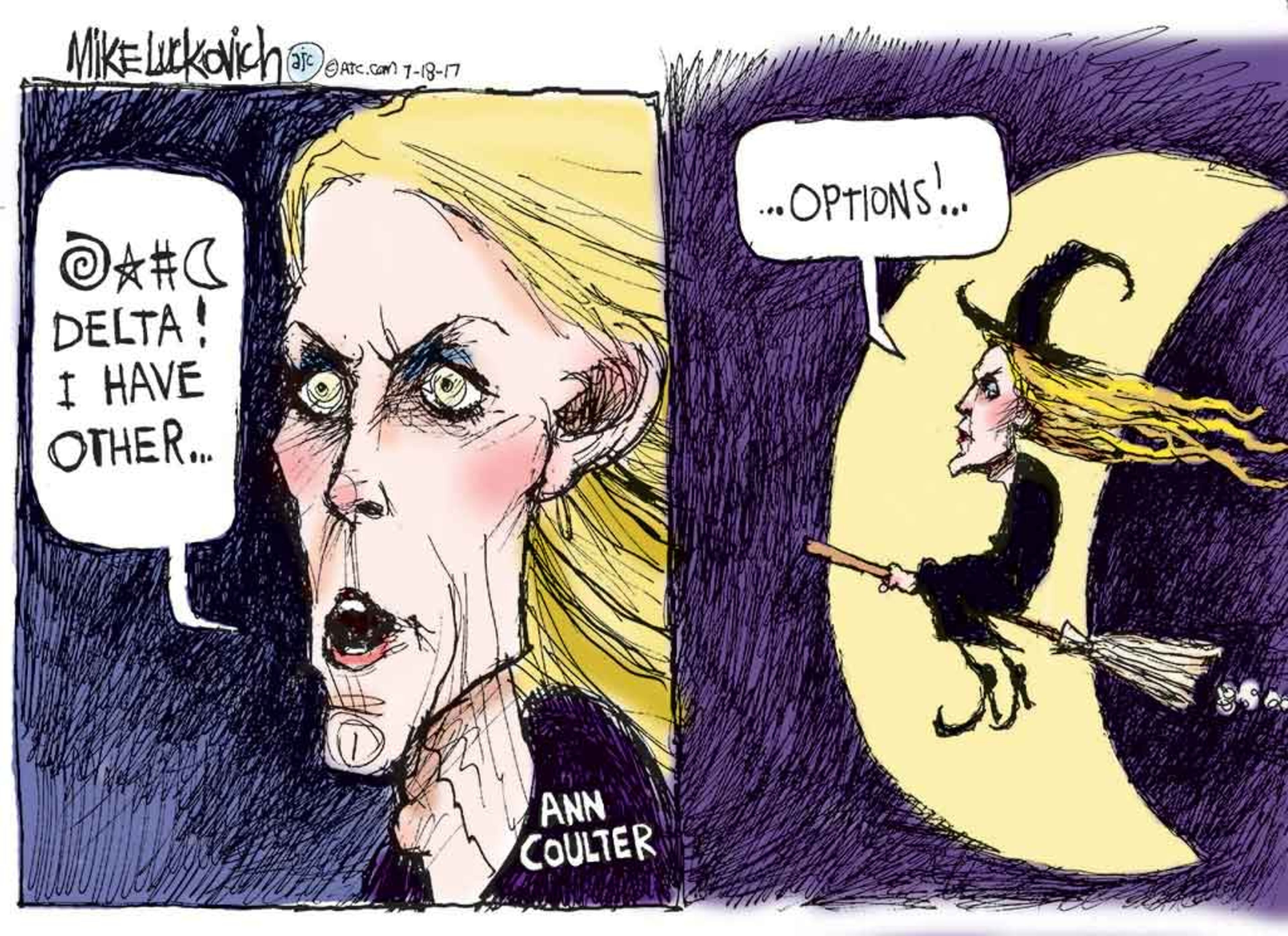 "This one's about an event that involved Delta Air Lines. It was a really fun drawing to do. I'm not a big fan of Ann Coulter; she can be so mean. She was tweeting about the way she was treated on a flight, or something, and it was just fun to draw her using another, fanciful way of getting to a destination."