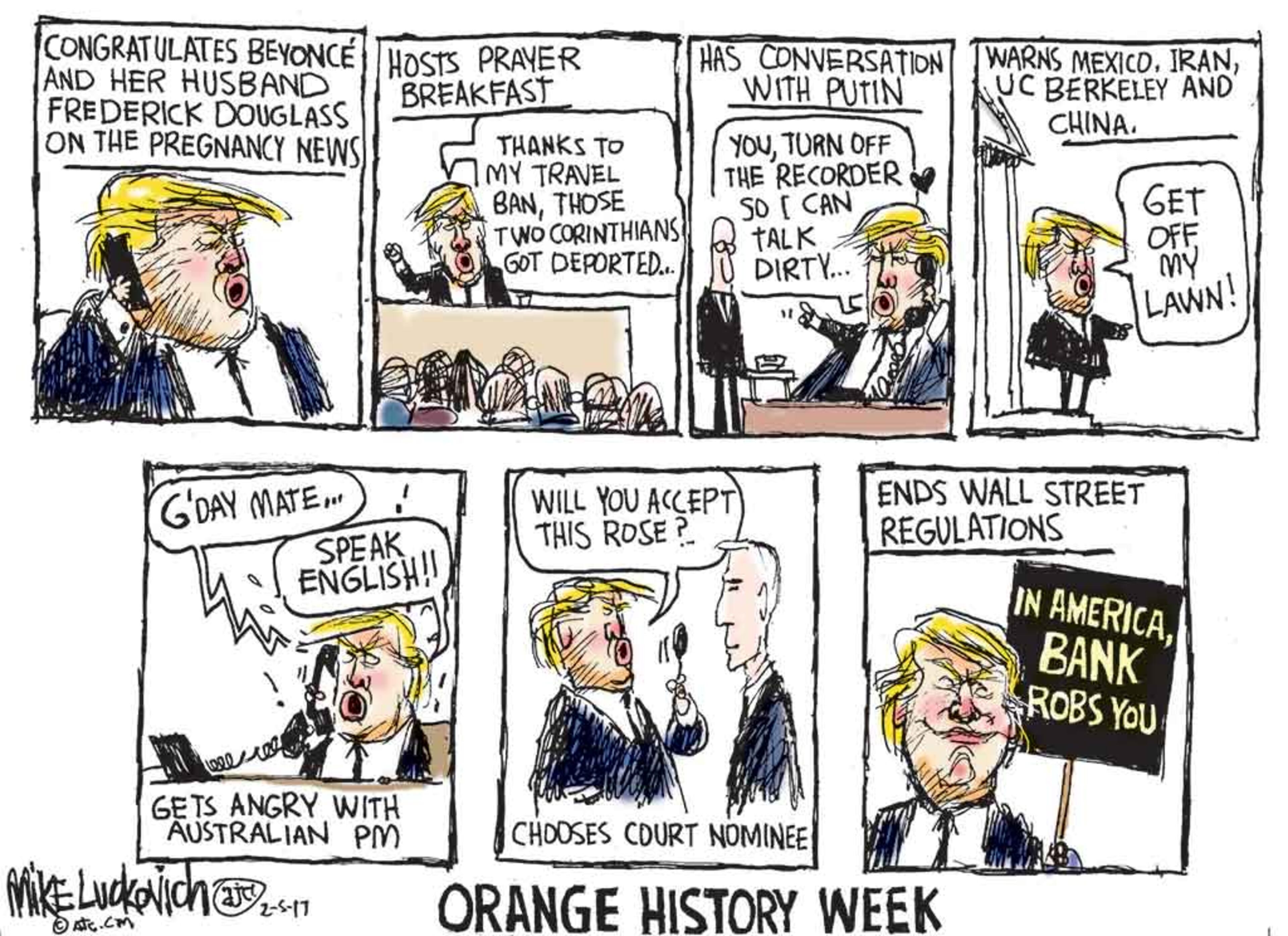 "This is what it's like for me every week since Trump has been president; he will say or do something and I'll ask myself, 'should I do a cartoon on that'? And another hour later, he'll say or do something else. In this cartoon, he did all of these things in one week. It was during Black History Month, so that's what led me to label this one Orange History Week."
